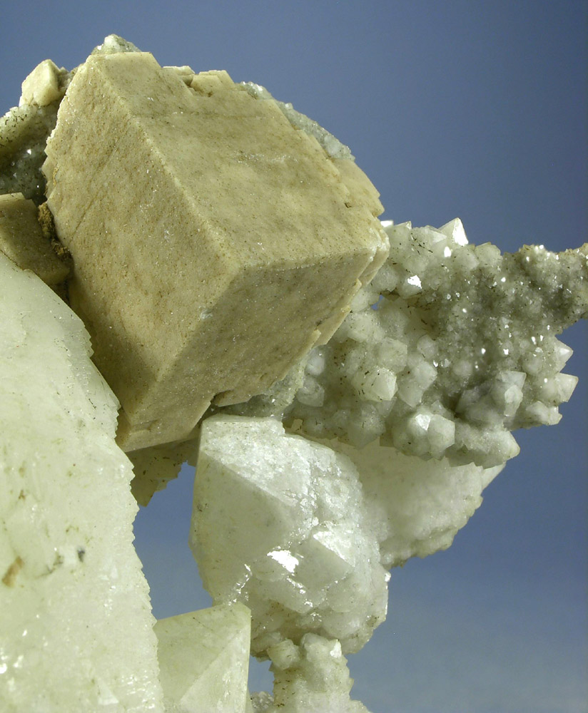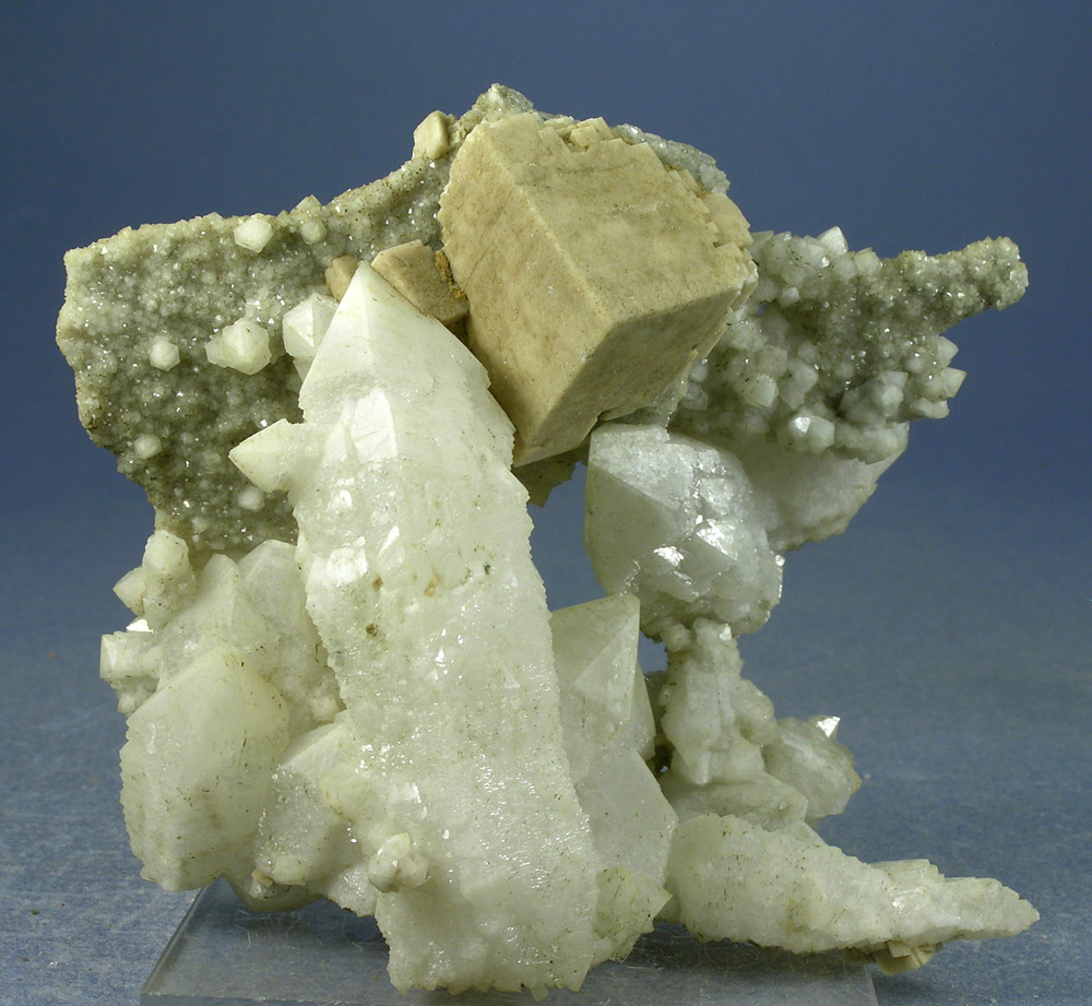 features a matrix composed of castle-formation Quartz crystals which are hosting a large rhomb of tan-colored Calcite.