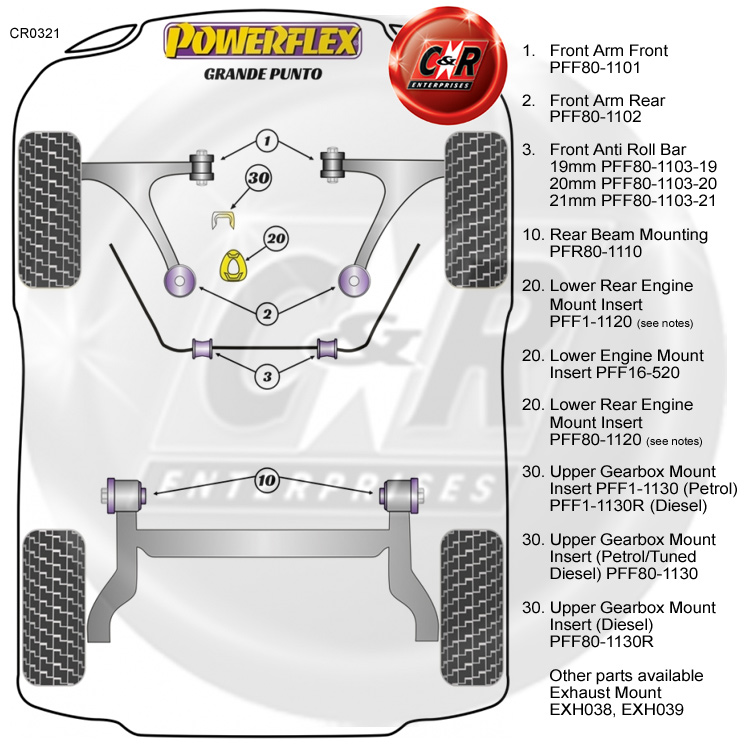 Um die korrekte PowerFlex Road oder Black Series Bush (ES) zu identifizieren, die Sie benötigen, lesen Sie bitte das Standortdiagramm weiter unten in der Liste.