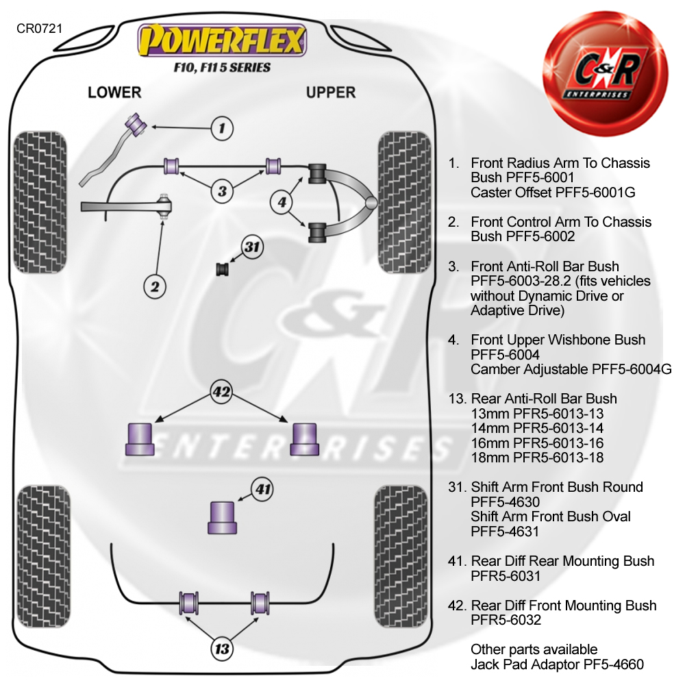 Um die richtigen Powerflex Road- oder Black Series-Buchsen zu identifizieren, die Sie benötigen, sehen Sie sich bitte das Positionsdiagramm weiter unten in der Auflistung an.