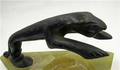VINTAGE JAGUAR CAR CLUB JUMPING JAGUAR METAL FIGURE very scarce (the first one I have seen in years). For club members only. Jumping figure is 8" long. The base measures 8.5" by 6". There is a chip on the base corner as seen in the photos.