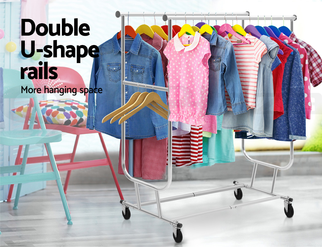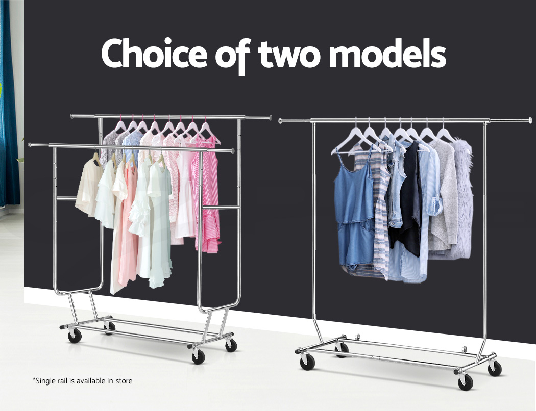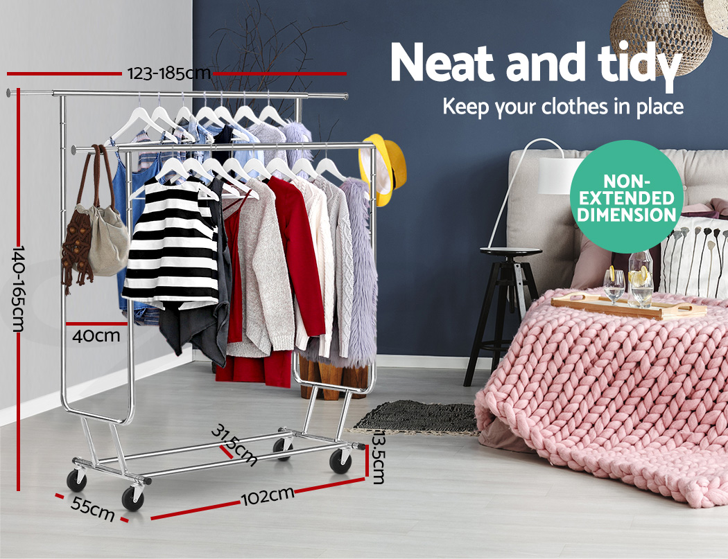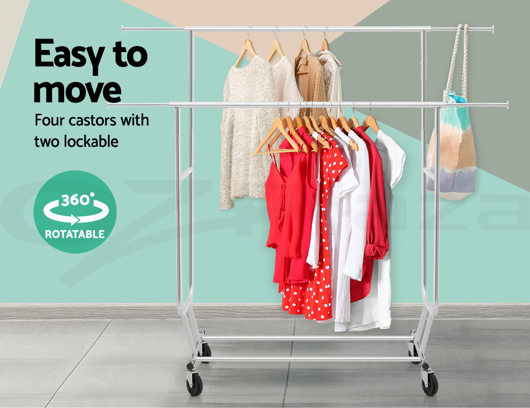 Our Artiss Adjustable Garment Rack is no lightweight when it comes to bearing heavy loads. Made of metal, the rack is designed to last and stand up to robust use.. And with its unique double U-shape hanging bar, you get twice the hanging room for your clothes. In fact, it can carry up to 60kg in total. The large 10cm castor wheels, that are also omni-directional and lockable, will not buckle easily under a big weight and make it easy to move the rack about. Better still, both height and width of the rack can be extended to fit in clothes of any shape and size. A clever design too is the anti-slip stoppers to prevent clothes from slipping off the hanging bar and plastic caps to prevent knock and damages to nearby walls and furniture. Not least, the rack can be folded down for easy storage or transport.