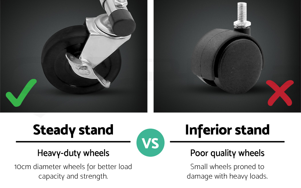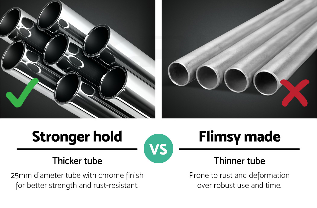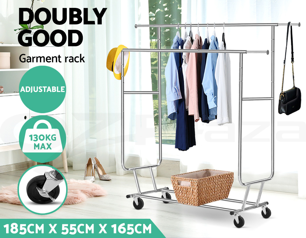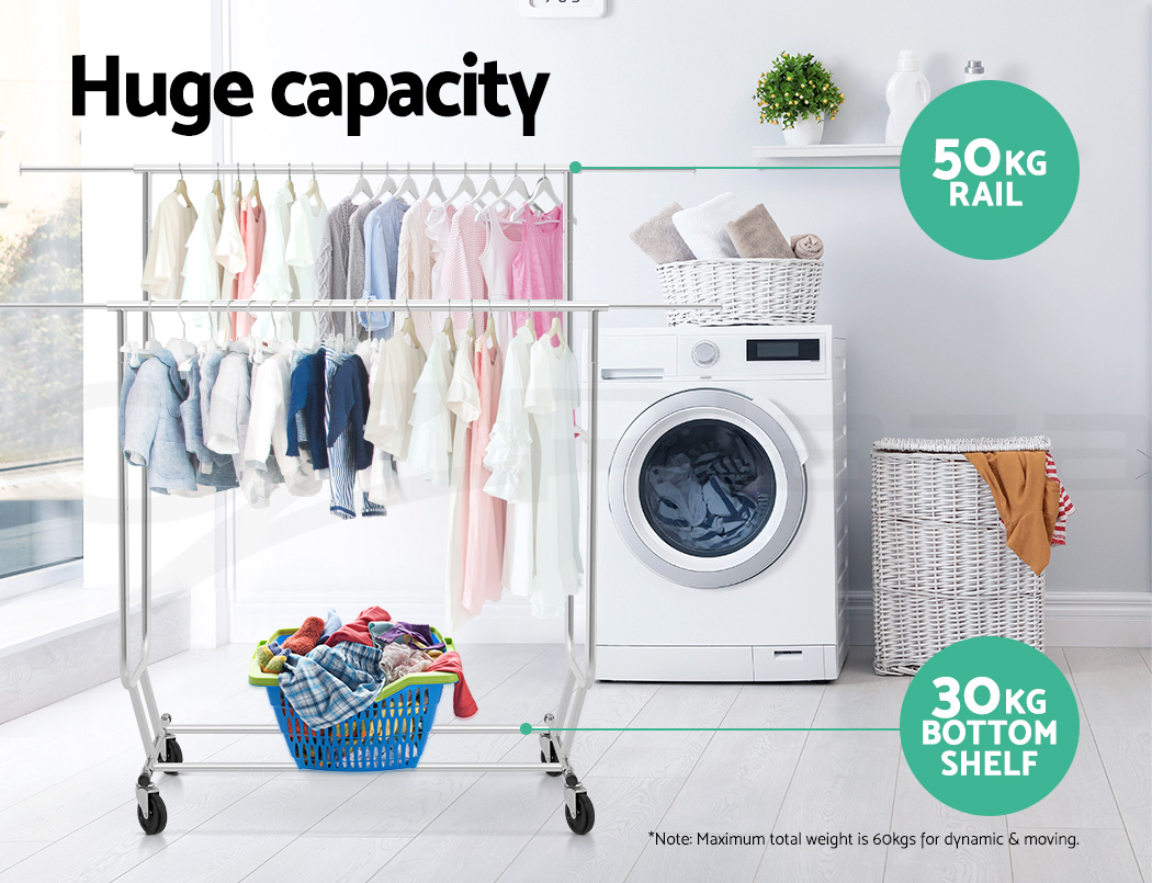 Our Artiss Adjustable Garment Rack is no lightweight when it comes to bearing heavy loads. Made of metal, the rack is designed to last and stand up to robust use.. And with its unique double U-shape hanging bar, you get twice the hanging room for your clothes. In fact, it can carry up to 60kg in total. The large 10cm castor wheels, that are also omni-directional and lockable, will not buckle easily under a big weight and make it easy to move the rack about. Better still, both height and width of the rack can be extended to fit in clothes of any shape and size. A clever design too is the anti-slip stoppers to prevent clothes from slipping off the hanging bar and plastic caps to prevent knock and damages to nearby walls and furniture. Not least, the rack can be folded down for easy storage or transport.