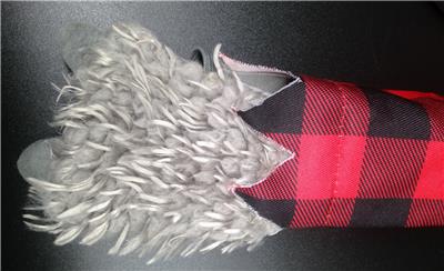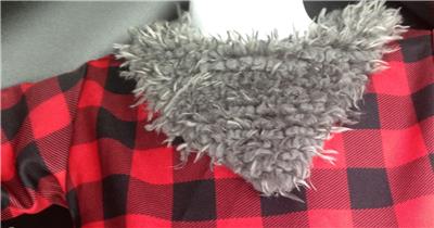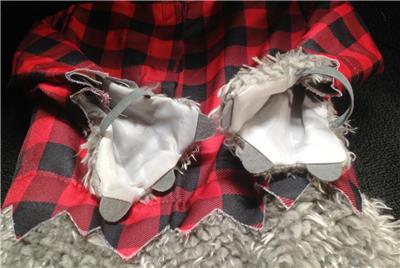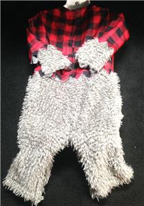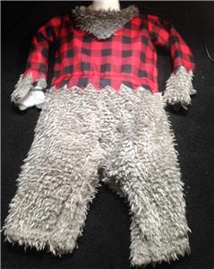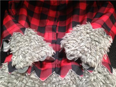 Big and bad? More like cute and cuddly! This wolf jumpsuit has a red and black plaid shirt with a gray fur chest. The matching hood features embroidered eyes, felt teeth, and your baby's face coming out of his mouth. The Velcro closure on the back keeps it comfortably in place. Pull down the attached hand covers and slip on the booties to keep your little wolf nice and warm on Halloween night.