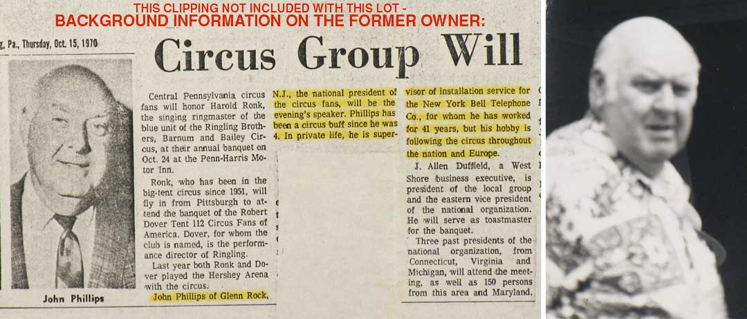 ![]() From the estate collection of John “Tiny” Phillips of Glen Rock NJ (1912-1989), an active and long-time member of the Circus Fans of America. See my other listings for more. A great opportunity to US collectors to get some vintage international circus memorabilia without the high cost of international shipping. For multiple purchases, you must wait for a combined invoice to be sent if you want to save money on postage. This may take a day, so relax. There is no return on shipping overpayments if you fail to wait for the combined invoice. |