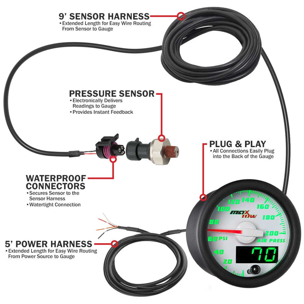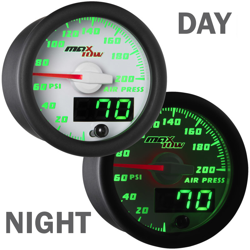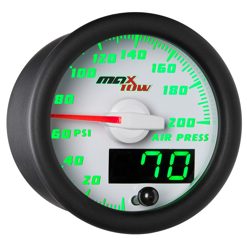 MaxTows White & Green Air Pressure Gauge is an electronically driven truck gauge that reads and displays your trucks air suspension from 0 to 200 PSI. This allows you to keep a close eye on the changing pressures of your trucks air brakes or aftermarket air suspension system to ensure you have the bags filled to the proper level. Parts required for installation are covered with accessories including a sensor, wiring harnesses and mounting hardware. Youll also receive Installation Instructions, Free Lifetime Tech Support and a One-Year Limited Warranty. Get ready to hit the road and Tow to the Max!