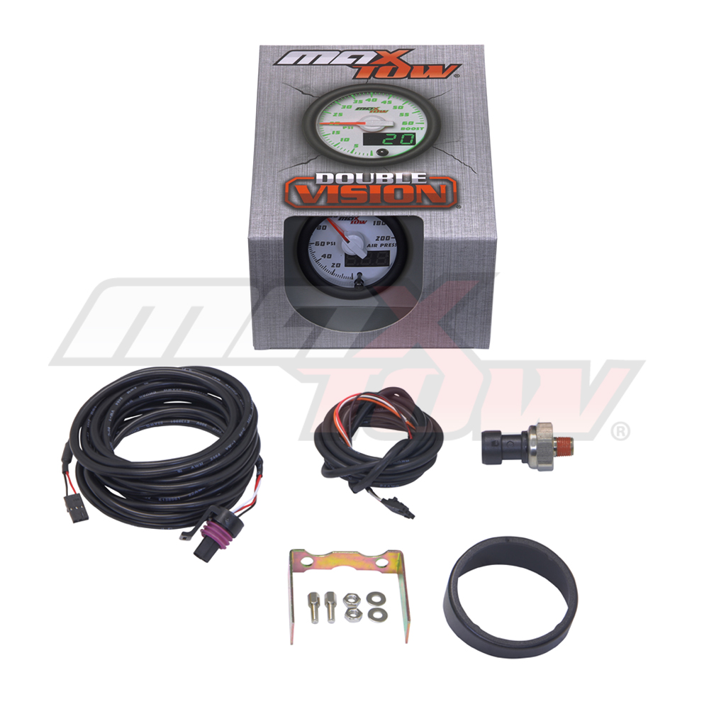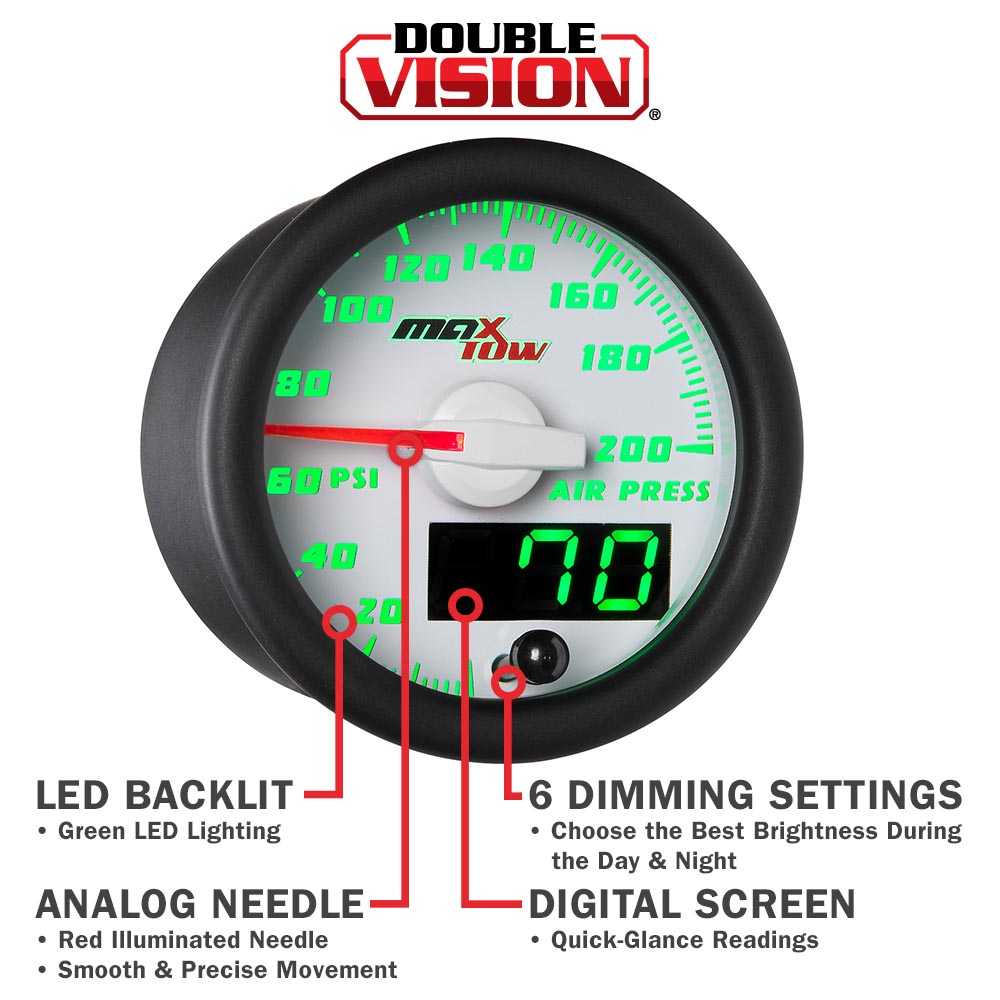 Get the best of both worlds with MaxTows Double Vision Gauge Series which features ultra-bright LED readouts on simultaneous analog and digital displays. The Double Vision Series provides form and functionality with precise gauge readings and a unique design that will enhance the look of your trucks cabin. These cutting-edge high performance gauges feature a white gauge face and green LED display. With every 2-1/16 (52mm) gauge youll experience incredibly accurate readings by utilizing either the illuminated red needle or responsive digital display. MaxTow gauges also feature Daytime Dimming Mode with 3 Customizable Brightness Settings, and Nighttime Dimming Mode which has 3 Customizable Brightness Settings. By adjusting the levels you can get just the right amount of lighting for optimal viewing, no matter what time of day or night.