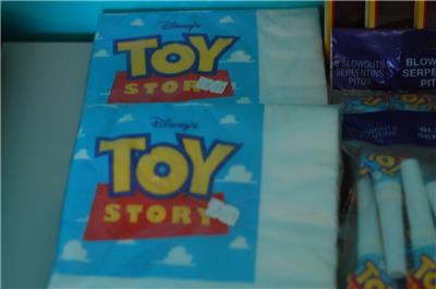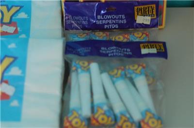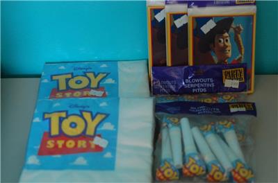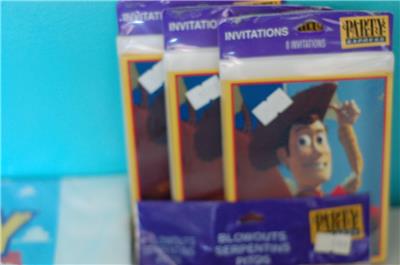 This is a great vintage New (Older Stock) of Toy Story featuring Woody. This comes with 3 packages of invitations "I'm Wranglin' Up All My Favorite Deputies!" (8 invitations), 2 packs of Luncheon Napkins (16 napkins per package), and 2 packages of blowouts. They are all in their original packaging. Please see the pictures below in the description.