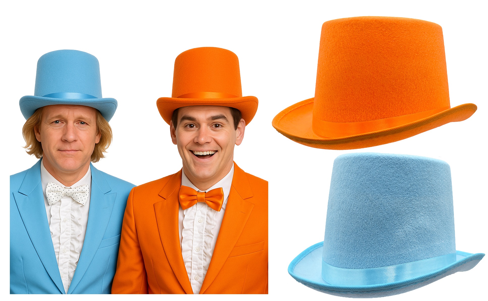 Bring iconic comedy to life with the Nicky Bigs Novelties Felt Top Hat Set. Inspired by one of the most legendary comedic pairs in cinema history, this set includes one bright orange and one vivid blue top hateach made from durable felt and featuring a coordinating satin ribbon band for a polished, picture-perfect look.