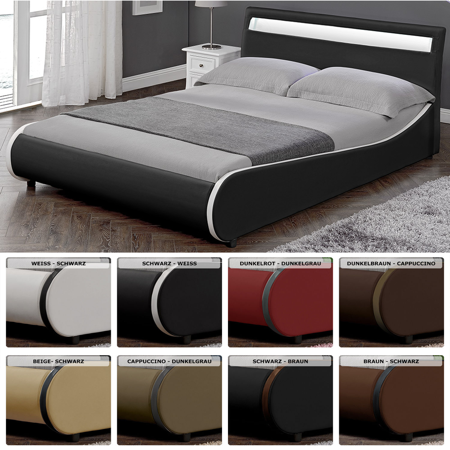 CORIUM® LED Polsterbett 140 180 x 200cm Kunst-Leder Doppel Ehe Bett Schwarz Weiß