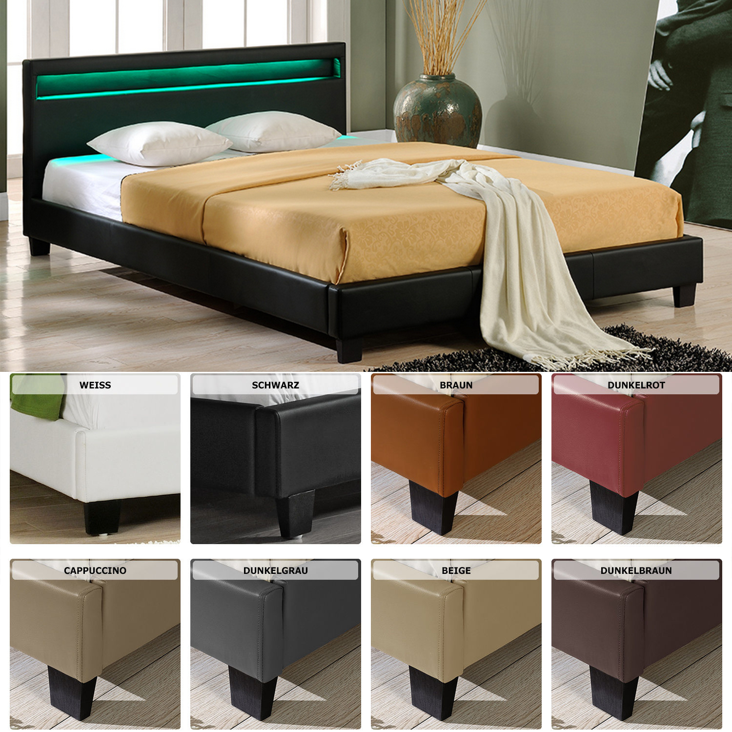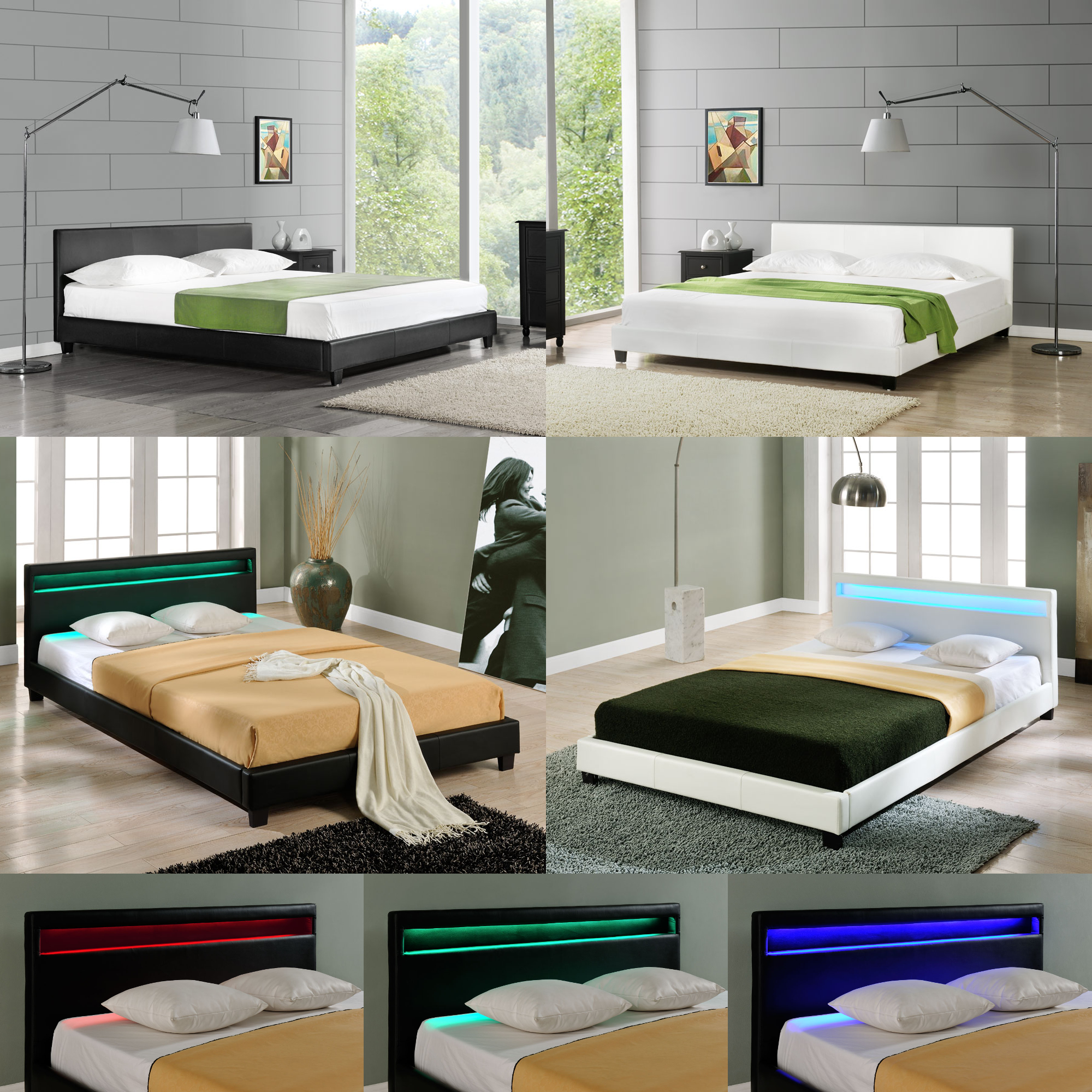 LED Polsterbett 140 160 180 200 x 200 cm Doppel Ehe Bett Gestell Kunst-Leder