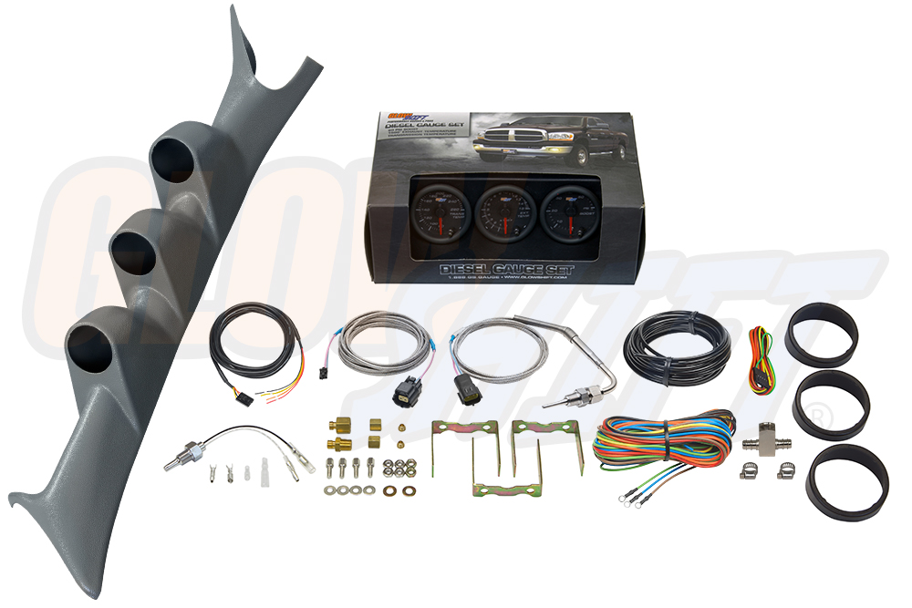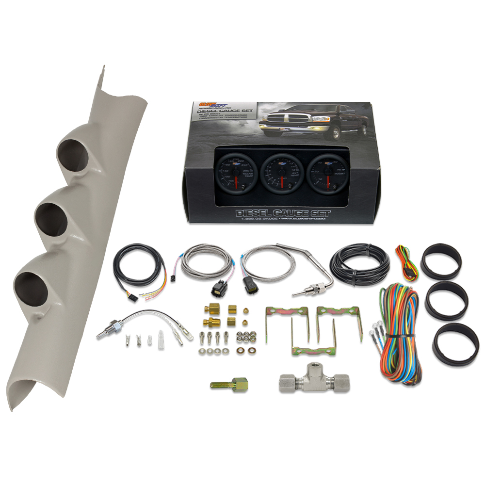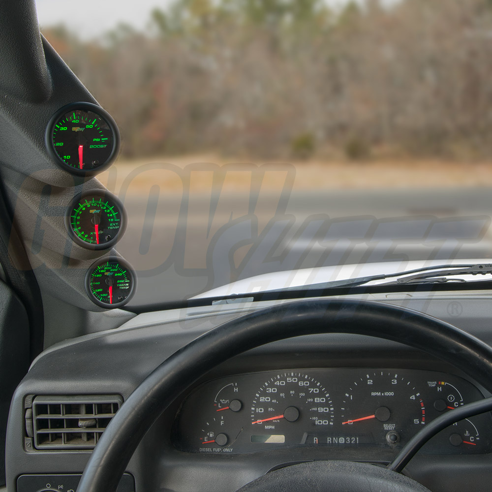 Monitor critical engine systems with GlowShifts Black 7 Color Series Triple Gauge Package for any 1999-2007 Ford Super Duty F-250/F-350 with a 6.0L or 7.3L Power Stroke. This diesel set comes with (3) 2-1/16 (52mm) gauges including a 60 PSI Boost Pressure Gauge, 1500° Fahrenheit Exhaust Gas Temperature (EGT) Pyrometer Gauge and a Transmission Temperature Gauge. Also featured is a Factory Color Matched Gray Triple Gauge Pillar Pod made specifically for the 99-07 Super Duty. To round out this custom gauge package, accessories including sensors, adapters, wiring harnesses and hardware are provided for installation. Youll also receive a Gauge Visor for blocking sun glare, Installation Instructions, Free Lifetime Tech Support and a One-Year Limited Warranty.