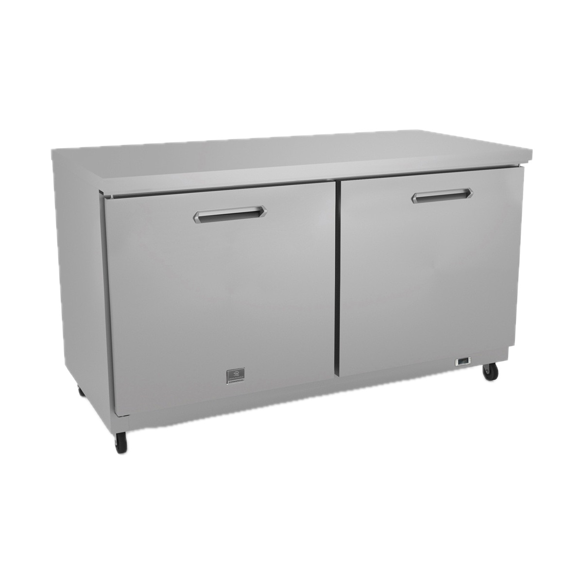 (738291) 2-solid hinged door undercounter refrigerator, reach-in, two-section, 35.5 inch tall, 60 inch wide, with exterior back panel, exterior bottom panel, and exterior top panel in galvanized steel, exterior side panel in 430 stainless steel; interior back, top and bottom panels in 304 stainless steel. Self-contained rear mounted refrigeration. Fin & tube condenser to improve the performances in high temperature environments. Automatic Defrost Cooling System and temperature control. Vinyl heavy duty adjustable, easy to handle and clean shelves. External temperature display. R600a gas in refrigeration circuit, 1/8 HP, 115v/60/1-ph, 3.0 amps, NEMA 5-15P, ETL Safety and Sanitation certified. 3/5 Years warranty.
