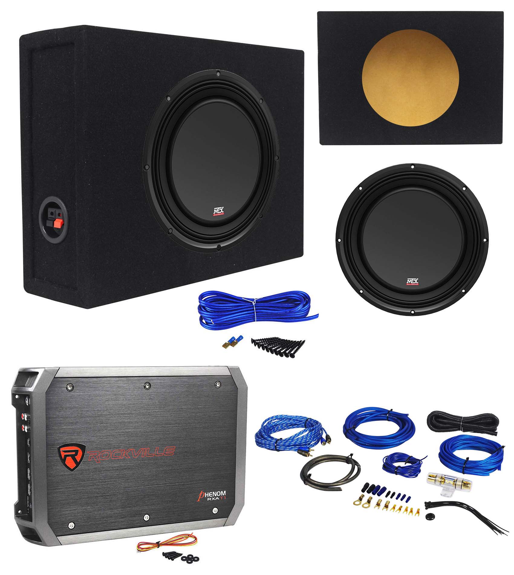 Package: MTX 3510-04S 10" 600 Watt Peak/300 Watt RMS 4-Ohm Car Subwoofer + Rockville RXA-T1 1500 Watt Peak/370 Watt Dyno-Certified RMS 2 Channel Amplifier Car Stereo Amp + Rockville RWK81 8 Gauge 2 Channel Complete Car Amplifier Installation Kit With a Set of 100% Twisted Pair of 100% Copper RCA Cable + Rockville RSTS10 Single 10" 0.62 cu. ft. Sealed Shallow/Truck Subwoofer Enclosure Box + COMPLETE SINGLE ENCLOSURE INSTALLATION KIT WITH 14 AWG SPEAKER WIRE + DRYWOOD SCREWS + SPADE TERMINALS