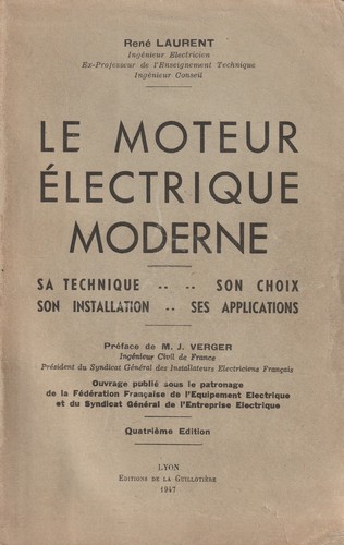 LA MOTEUR ELECTRIQUE MODERNE, SA TECHNIQUE, SON CHOIX, SON INSTALLATION, SES APPLICATIONS DE RENE LAURENT AUX EDITIONS DE LA GUILLOTIERE 1947