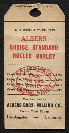 CA FET34 Albers Choice Standard Rolled Barley. Albers Bros. Milling Co. Los Angeles. Used. VF tear, small faults