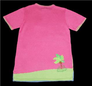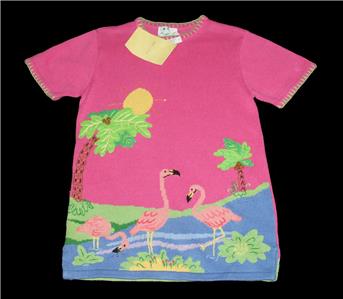 NEW WITH TAG: Quacker Factory Rhinestones and Sequins Beach Flamingos Palm Trees Long Pullover Short Sleeve Sweater. Appliques and yarn embroidered design accented with beads and sequins. Lower 3" side splits. Fun and unique. Hand wash, 55% ramie, 45% cotton. Women's XS (this appears to run towards a Small) - please see measurements for accurate fit. Approx. measurements:
