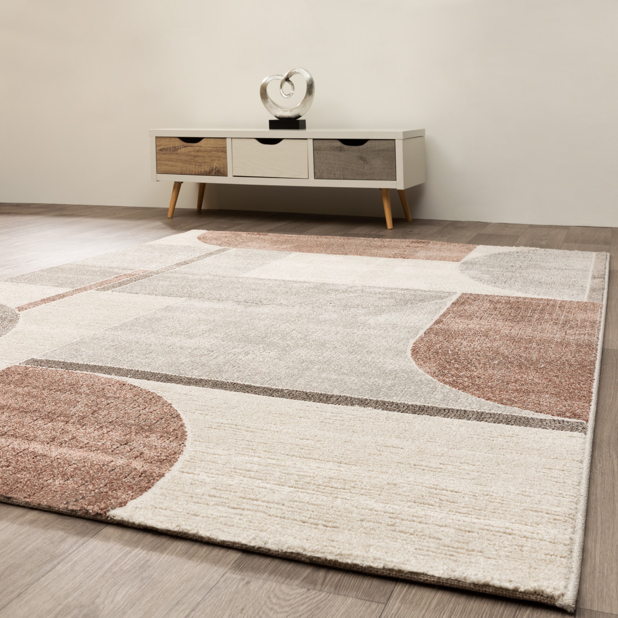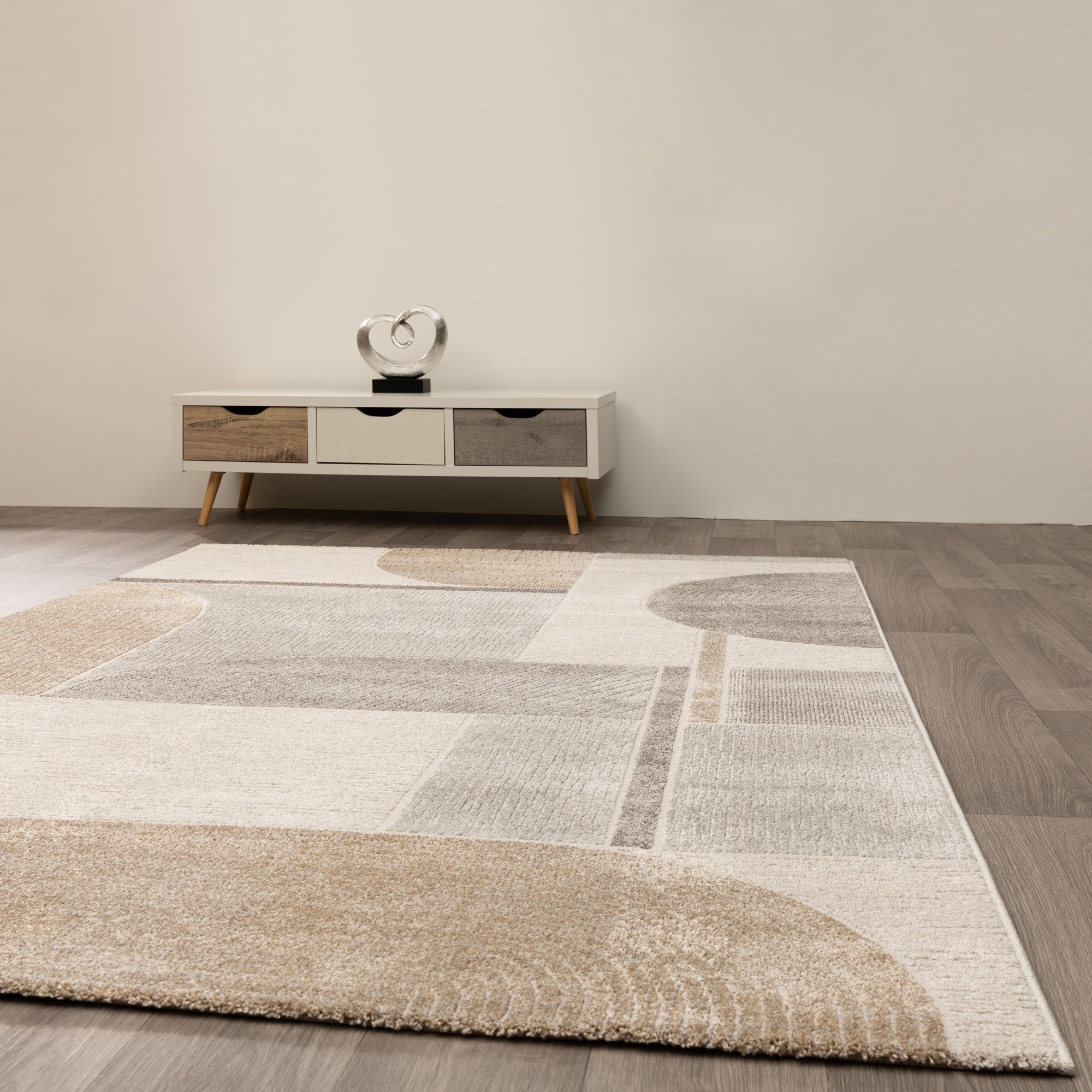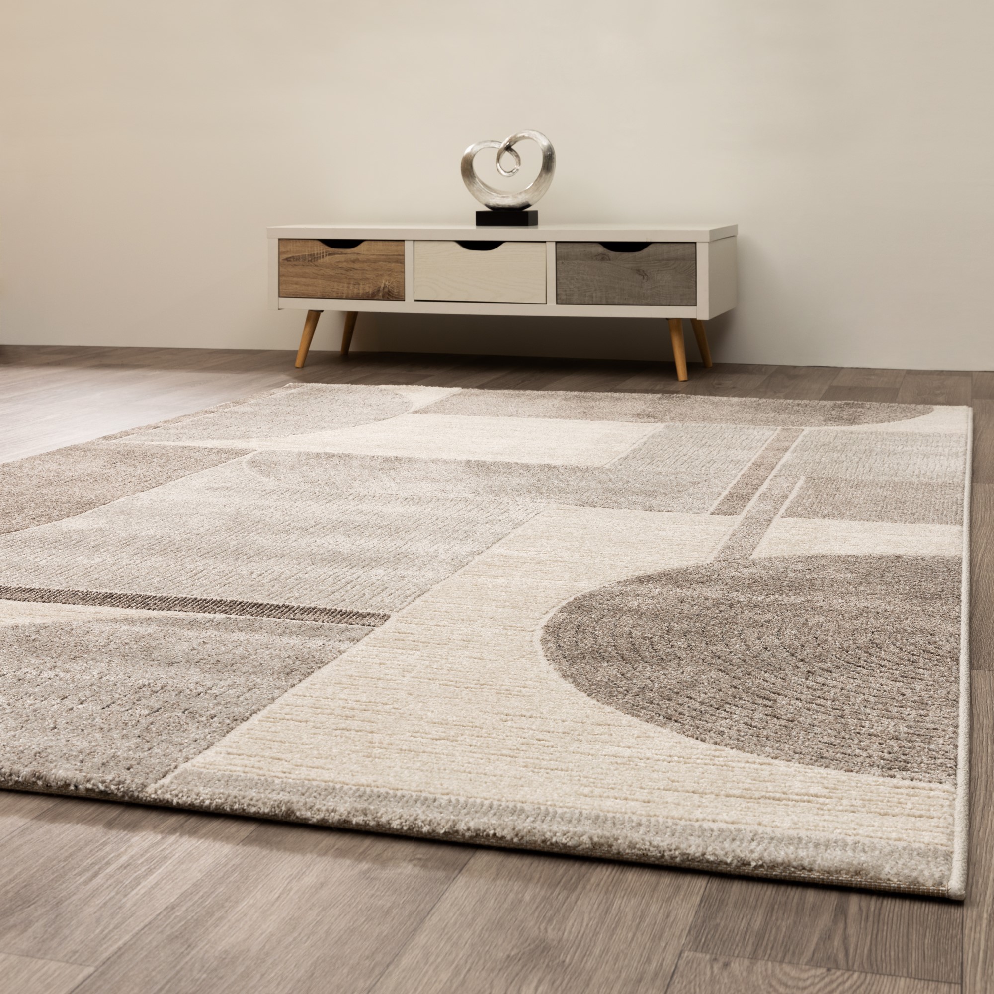 Die verschiedenen Formen beim Teppich Amantea, geben dem Teppich eine moderne und künstlerische Art. Die dezenten Farben spiegeln eine ruhige Atmosphäre wider.
