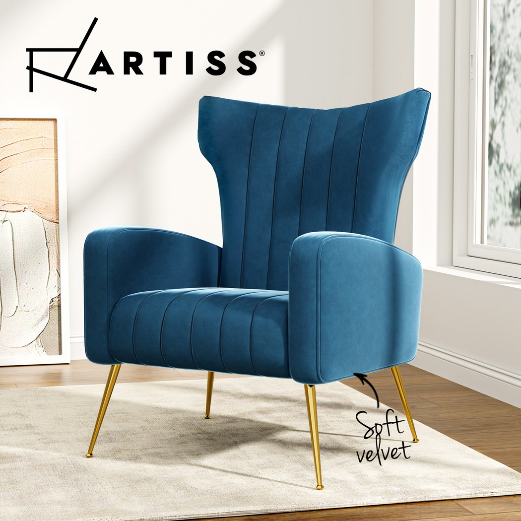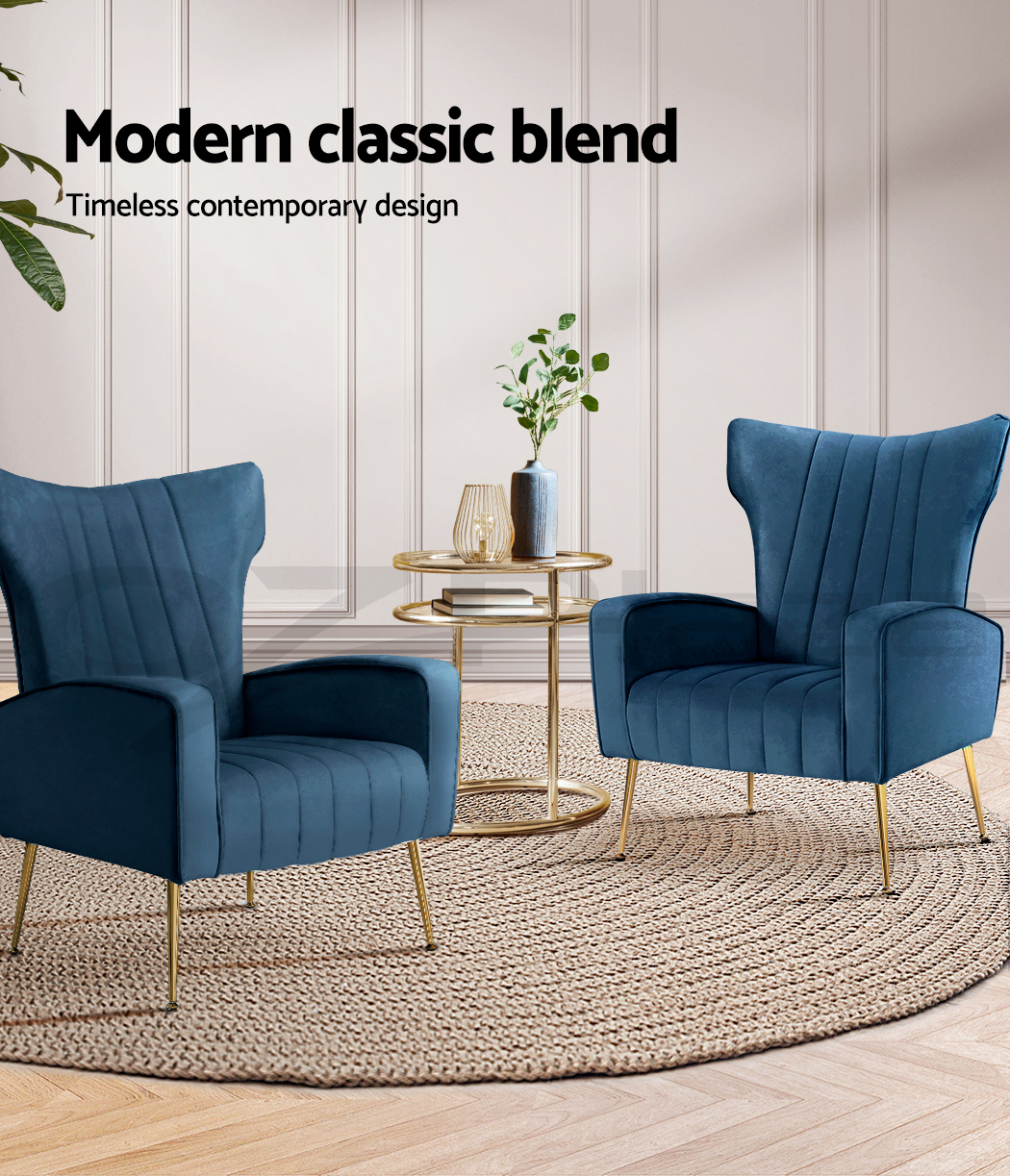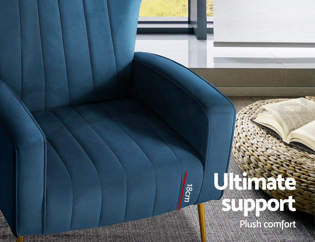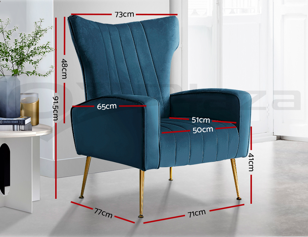 Artiss Kate armchair offers a wide, high-back, and welcoming seat with comfortable armrests for you to relax. It is ideal for every corner of your space where you want to add soft and comfy touches. Crafted with great attention to details, this armchair feature solid wood construction with high resilience foam. It is quite sturdy and will withstand the test of time. Our Kate armchair is upholstered in soft velvet fabric that epitomises luxury with its smooth and shiny appearance and adds a cosy and relaxing feel to your space. Plus, the splayed golden metal legs with floor protectors will offer optimum stability and protection to your floors and add a luxurious charm to your space with its gorgeous presence.