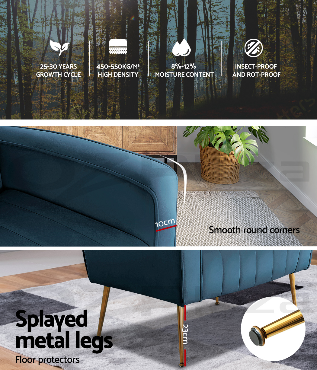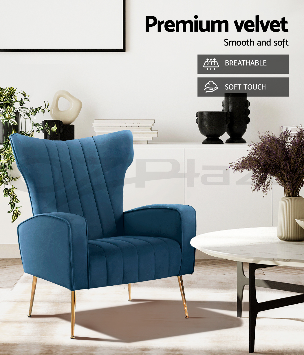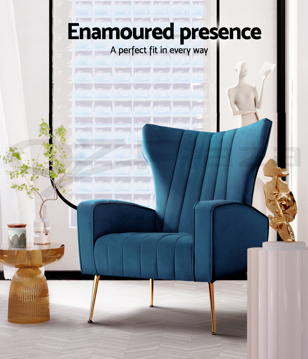 Artiss Kate armchair offers a wide, high-back, and welcoming seat with comfortable armrests for you to relax. It is ideal for every corner of your space where you want to add soft and comfy touches. Crafted with great attention to details, this armchair feature solid wood construction with high resilience foam. It is quite sturdy and will withstand the test of time. Our Kate armchair is upholstered in soft velvet fabric that epitomises luxury with its smooth and shiny appearance and adds a cosy and relaxing feel to your space. Plus, the splayed golden metal legs with floor protectors will offer optimum stability and protection to your floors and add a luxurious charm to your space with its gorgeous presence.