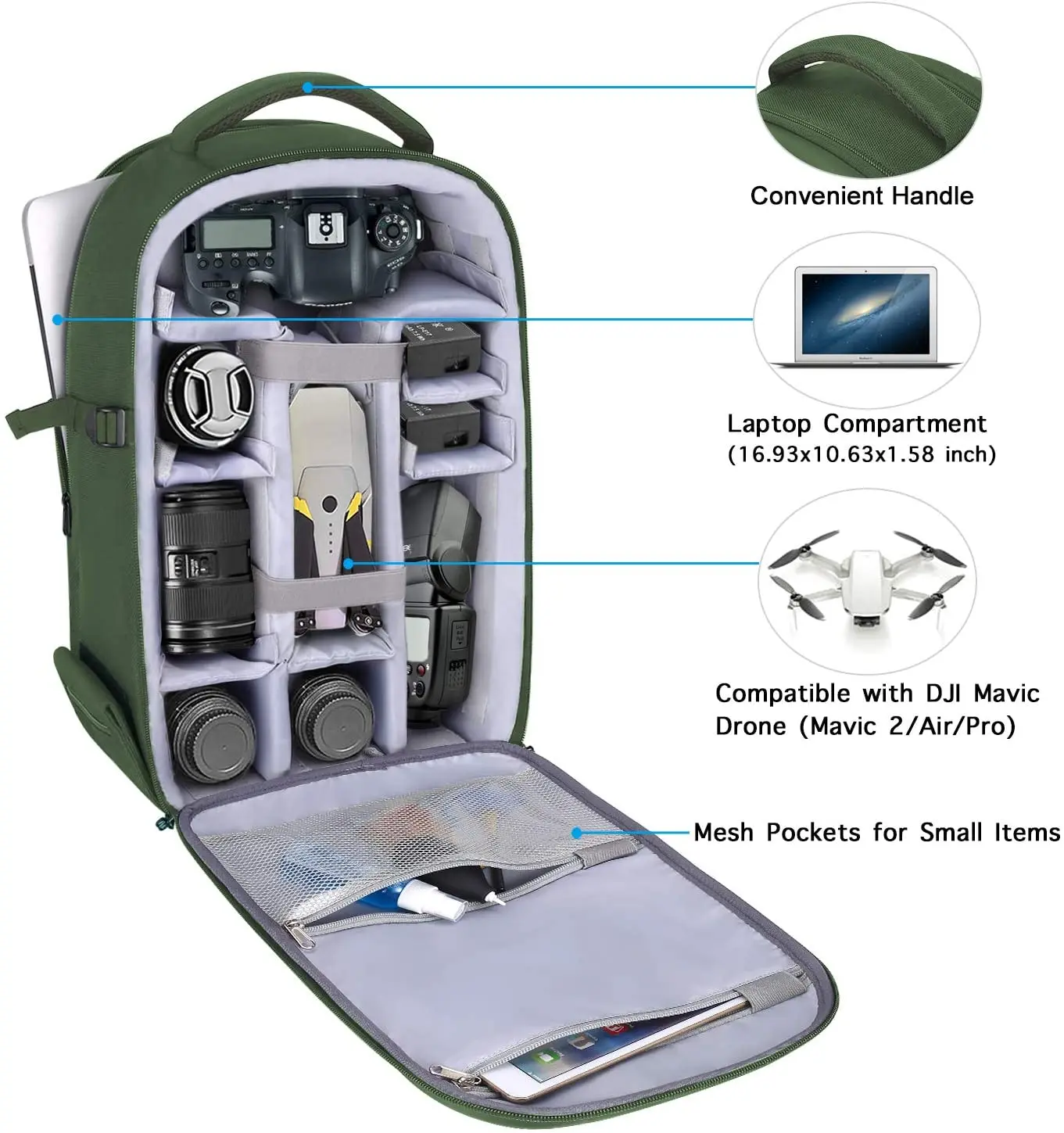 This multifunctional camera bag is professionally designed for DSLR / SLR / Mirrorless cameras of different brands. Compatible with Nikon D5600, D5300, D3500, D3400, D3300, D3200; Canon EOS Rebel T6, T6i, SL2 and other standard-size DSLRs. Also desigend to be compatible