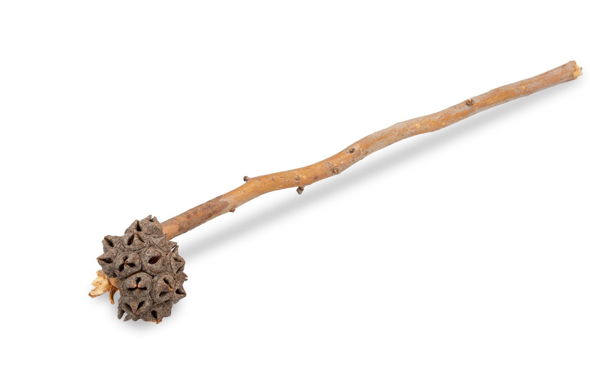 Bei dieser exotischen Trockenblume handelt es sich um eine Eucalyptus Lehmannii mit Naturstiel. Die Limestone Marlock weist insgesamt eine Länge zwischen 30 und 40 Zentimetern auf, wobei der Stiel einen Durchmesser von circa einem Zentimeter hat und die Blüte, d.°h. die verholzte Eukalyptus Frucht, eine Größe zwischen drei und fünf Zentimetern besitzt. Der Spidergum Kopf kann zu verschiedenen Zwecken genutzt werden, wird allerdings vorrangig im Bereich der Floristik eingesetzt. So werden die Eukalyptus Früchte mit Stiel beispielsweise verwendet, um in Vasen arrangiert oder in Schalen ausgelegt zu werden. Darüber hinaus können die Spidergum Köpfe in Deko Kränzen und Deko Gestecken weiterverarbeitet werden. Bei diesen Limestone Marlock handelt es sich um exotische Naturdekorationselemente, die sowohl hinsichtlich ihrer Farbe als auch der Form und der Größe von der Abbildung und der Beschreibung abweichen können.