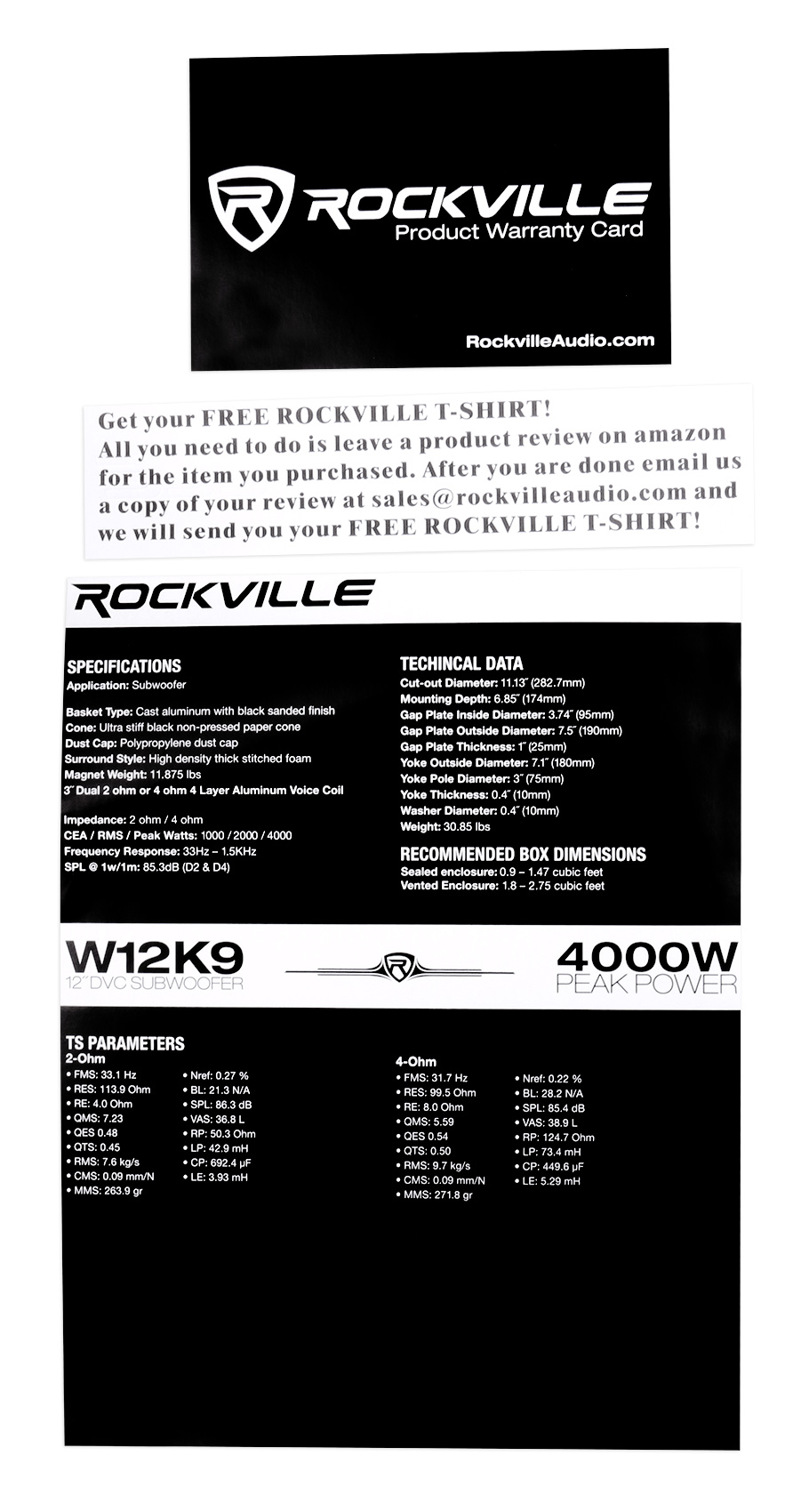 Package: Rockville W12K9D4 12" 4000 Watt Dual 4-Ohm Car Subwoofer - CEA Compliant + Rockville RSQ12S Single 12" .75 cu.ft. MDF Sealed Subwoofer Enclosure Box - Constructed Using Grade "A" 3/4" MDF Wood, Proudly Made in America! + COMPLETE SINGLE ENCLOSURE INSTALLATION KIT WITH 14 AWG SPEAKER WIRE + DRYWOOD SCREWS + SPADE TERMINALS