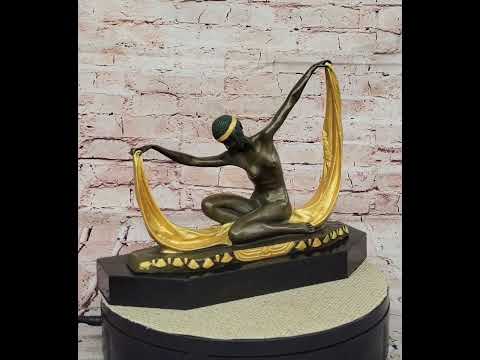 With the poise of a true artist, this exquisite dancer takes her initial pose on the stage. With a gentle bow of her head, she holds a flowing yellow sash gracefully between her outstretched arms. Seated upon her heels, her lithe form takes on a slight curve, a testament to her mastery of movement. The fusion of colors is a visual delight – her hair, adorned with a gold headband, cascades in a green patina, complementing the warmth of her brown patina skin tone.