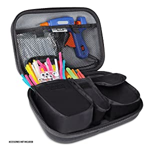 Organize your arts and craft items and accessories in one travel ready case and protect it from damage. The interior features three removeable, customized storage compartments for all accessories like glue sticks, pipe cleaners, googly eyes, felt fabric, cotton balls, plastic jewels, and more arts & craft items. The inside also contains a mesh side pocket for storing larger items that won't fit in some of the more compact pockets. Keep your wired or wireless glue gun in this case and leave it at home, in the car, in your bag, and anywhere in between.