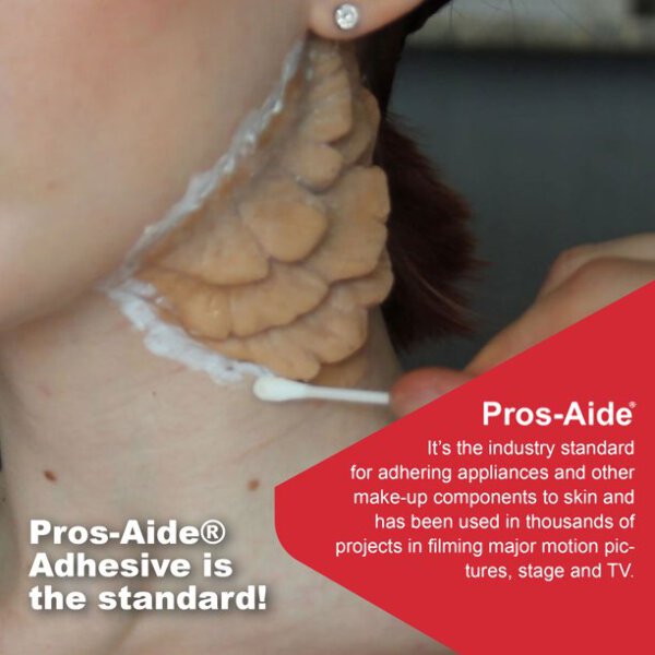 For over 30 years, Pros-Aide® adhesive has been the worldwide industry standard for use in the professional medical prosthetic and special effects make-up industries. Pros-Aide® is specifically formulated for sensitive skin and is non-irritating. All Pros-Aide® products are water-based and completely safe. When dry, Pros-Aide® adhesive gives absolute waterproof bonds to all skin surfaces – the kind of adhesion that is required with medical prosthetic applications and the demanding needs of professional special effects make-up artists.