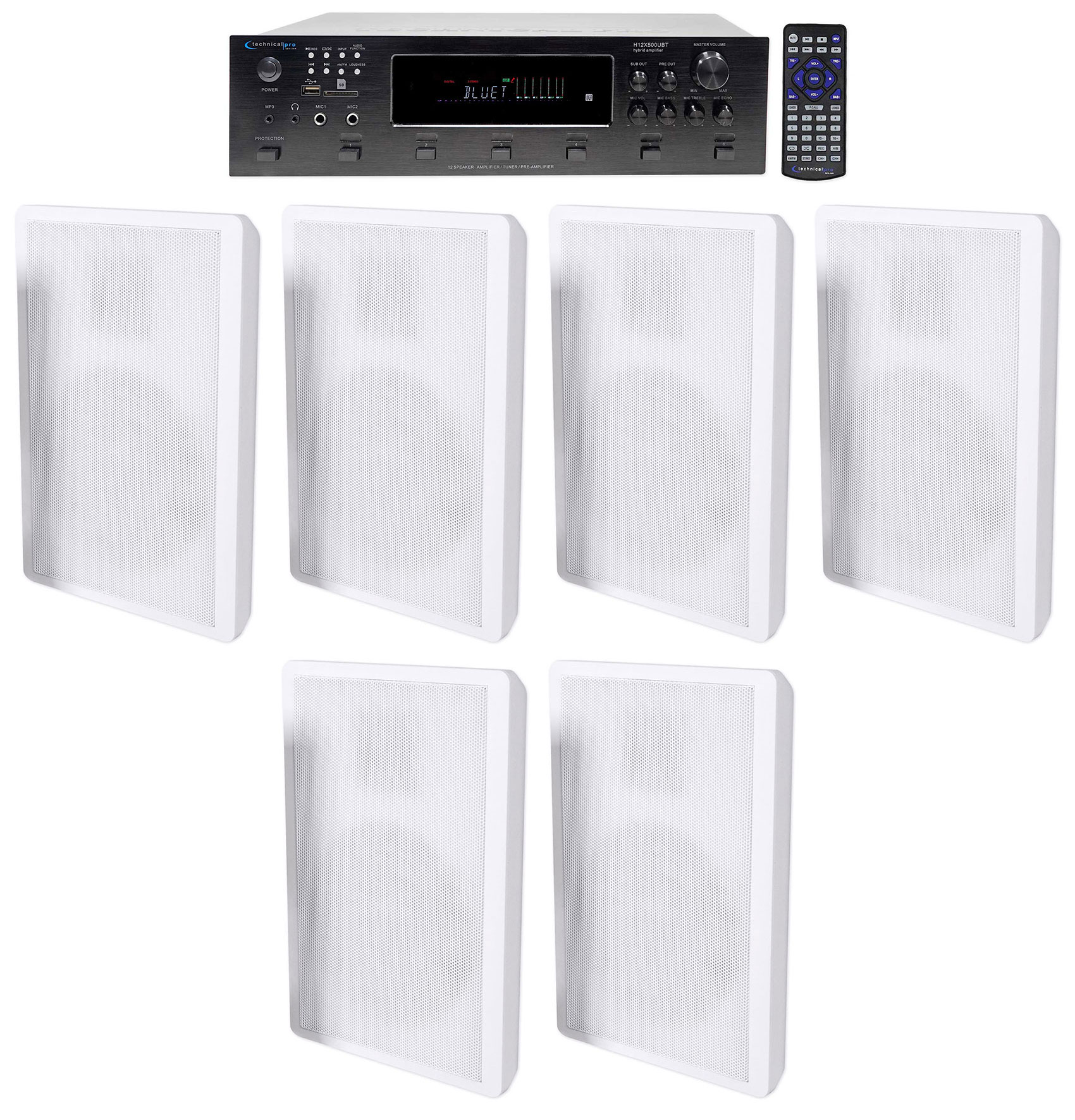 Package: Technical H12X500UBT 6000W (6) Zone Home Theater Receiver with Bluetooth + (3) Pairs of Rockville RockSlim White 5.25" 240 Watt Home Theater Slim Speakers with Easy Wall Mount Brackets