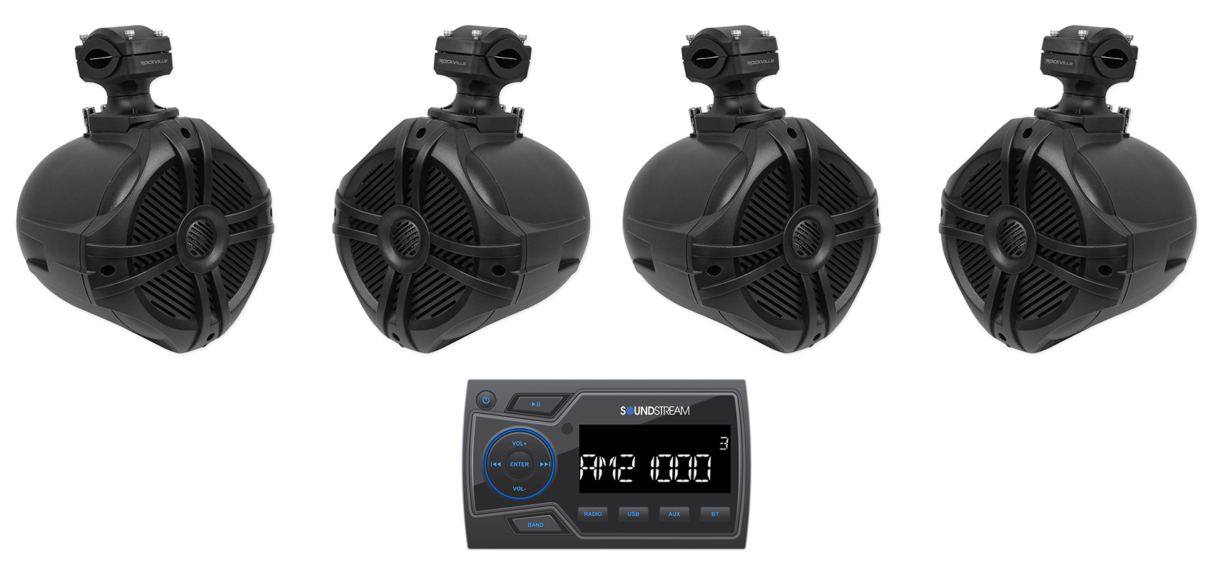 Soundstream MHU-32 Marine Boat ATV/UTV Bluetooth Receiver+4) 6.5" Tower Speakers