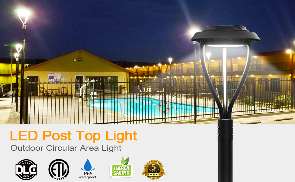 High Heat Dissipation & Long Durable: This led post top pole lights used IP65 waterproof rating for all weather conditions-pure, aluminum die-cast housing provides excellent heat transfer, extending component life and preventing damage, low cost maintenance, great for outdoor applications such as city expressway, trunk road, factories, schools, garden, parking lots light, public parks etc.