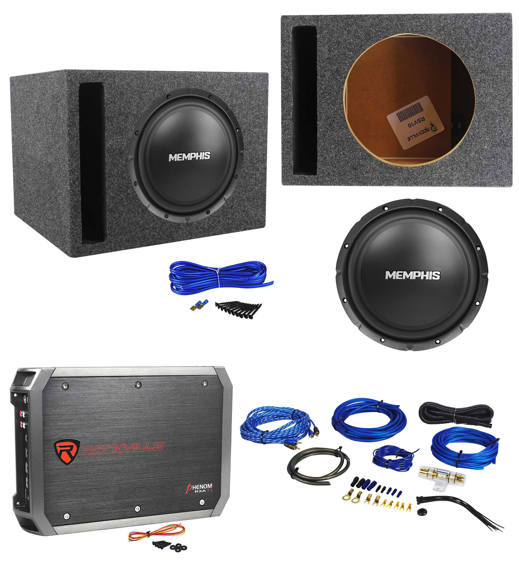 Package: Memphis Audio SRX1040 10" SRX Car Subwoofer Audio Sub 400w Peak / 200w RMS 4 Ohm + Rockville RXA-T1 1500 Watt Peak/370 Watt Dyno-Certified RMS 2 Channel Amplifier Car Stereo Amp + Rockville RWK81 8 Gauge 2 Channel Complete Car Amplifier Installation Kit With a Set of 100% Twisted Pair of 100% Copper RCA Cable + Rockville RSV10 Single 10" 1.0 cu. ft. Vented Subwoofer Enclosure - Made With 3/4" Grade "A" MDF Wood - Made in America Using the Highest Quality Materials for the Best Performance and Sound Possible From Your Subs + COMPLETE SINGLE ENCLOSURE INSTALLATION KIT WITH 14 AWG SPEAKER WIRE + DRYWOOD SCREWS + SPADE TERMINALS