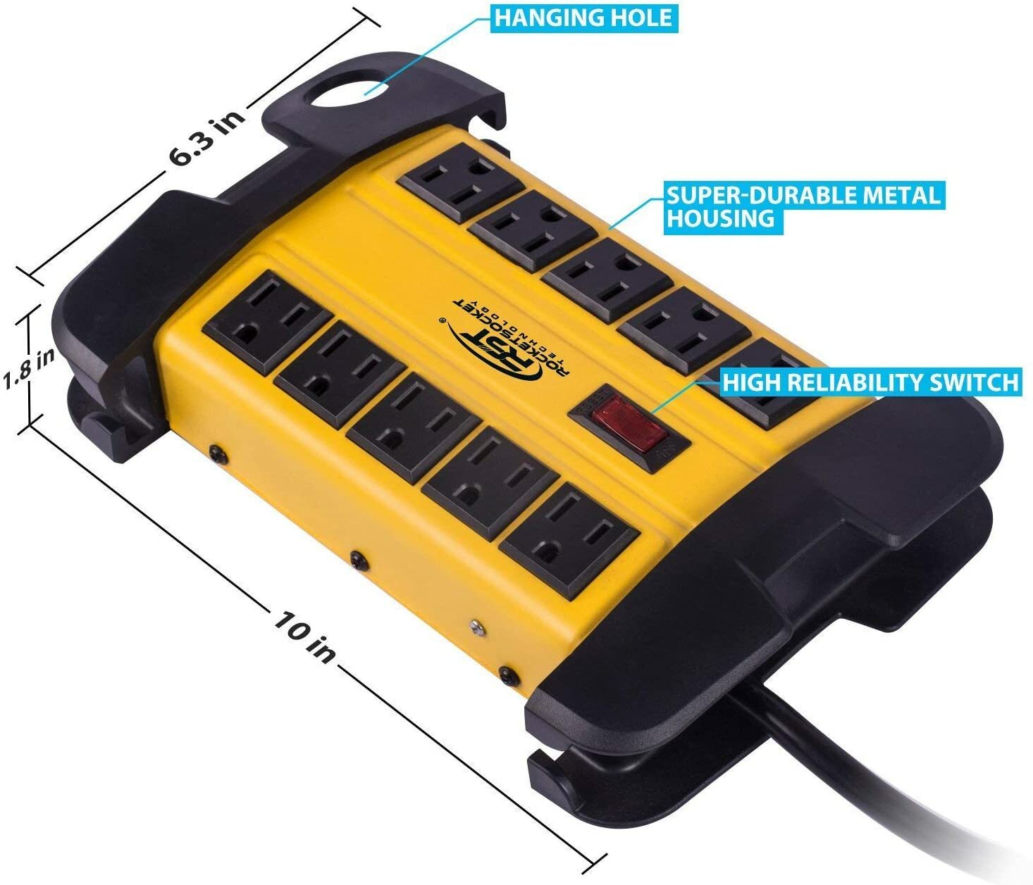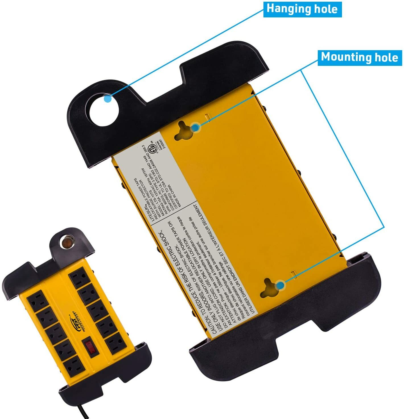 The power switch lights up when power is on letting you know if the circuit breaker has tripped. In the event of an overload the circuit breaker will trip protecting your devices and reducing fire risk. To reset the circuit breaker, switch the power switch to the OFF position and reset to the ON position. | Rectangle Design can save room and easily plug in all your devices in workbench. Cord holder design can wrap 15 feet cord easily around the power strip , hanging hole can help with storage. Circuit breaker will trip protecting your devices and reducing fire risk |