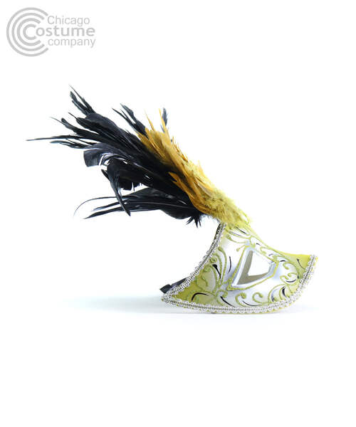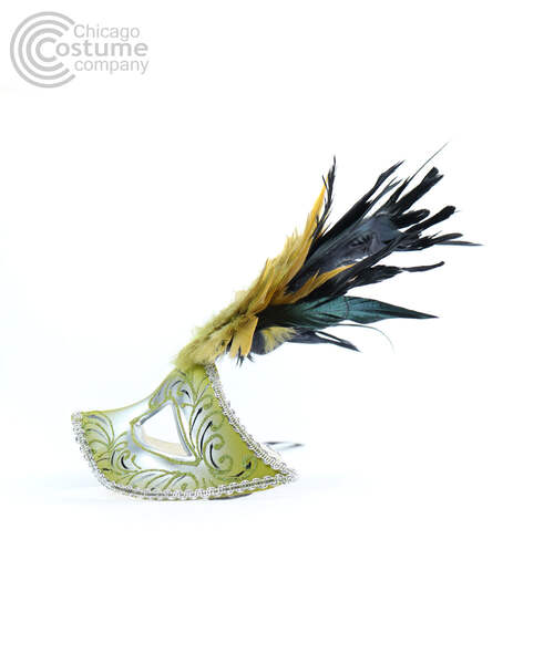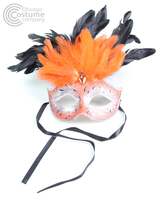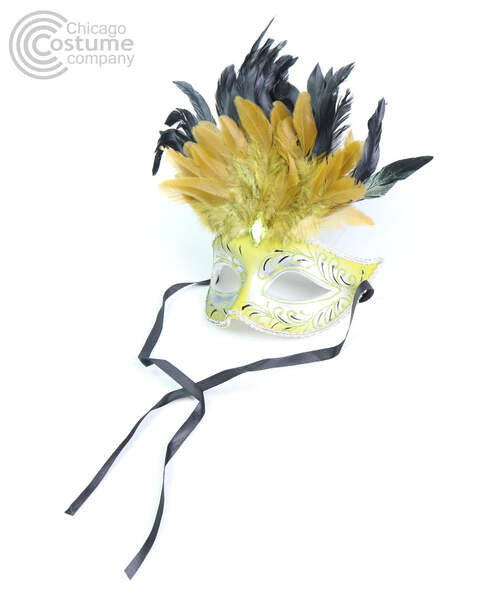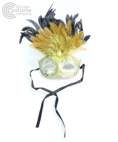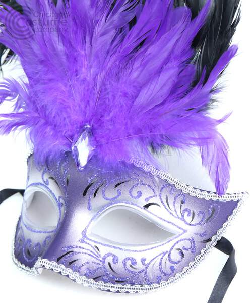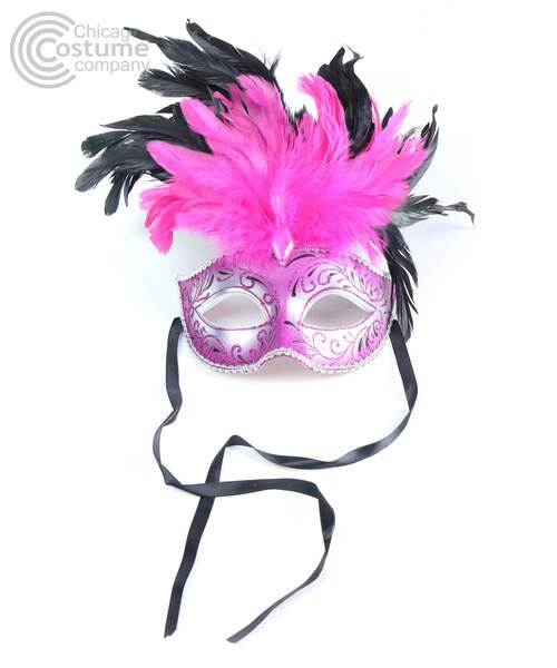 Mask features colored/silver base with colored glitter details, colored & black center feathers, gem, and silver trim. Secures with two black ribbon ties. One size fits most adults.