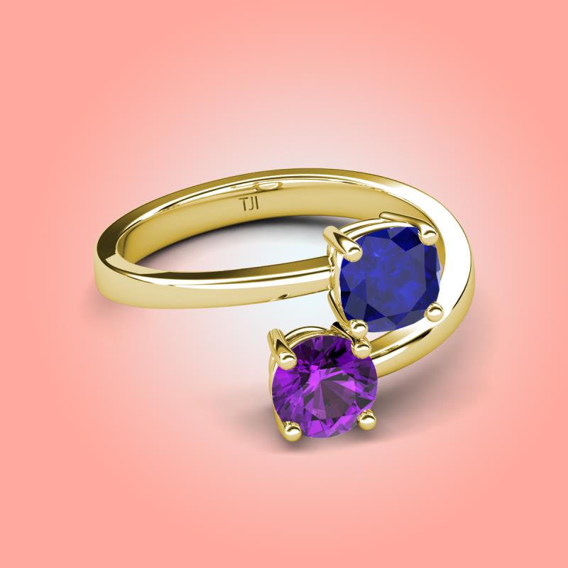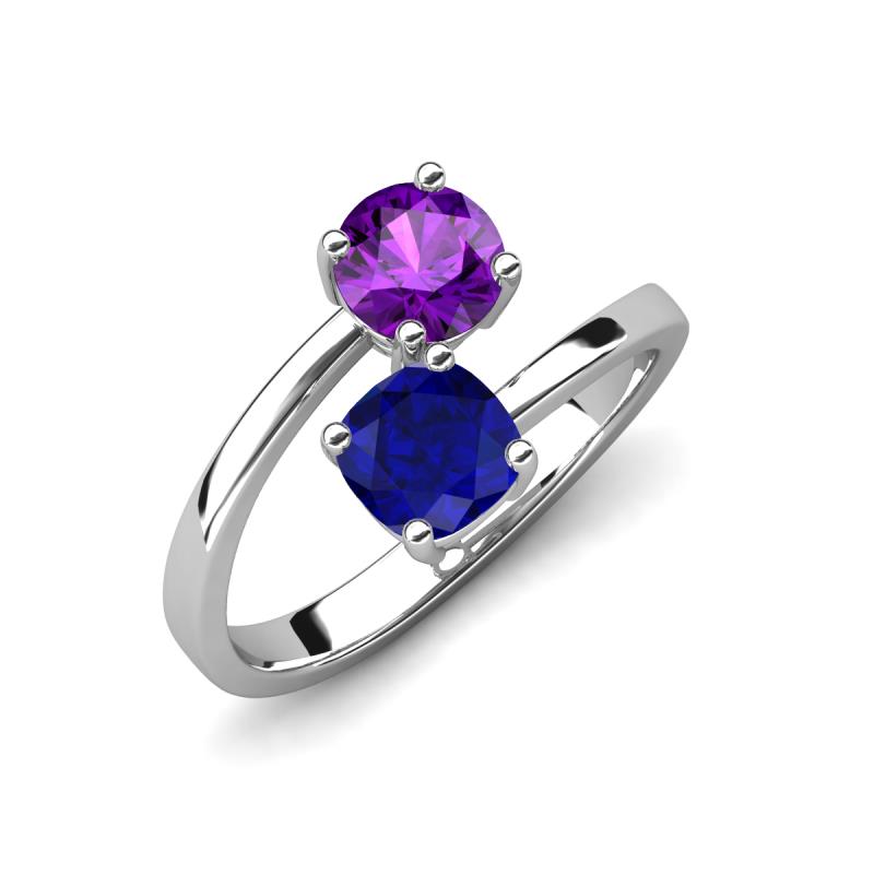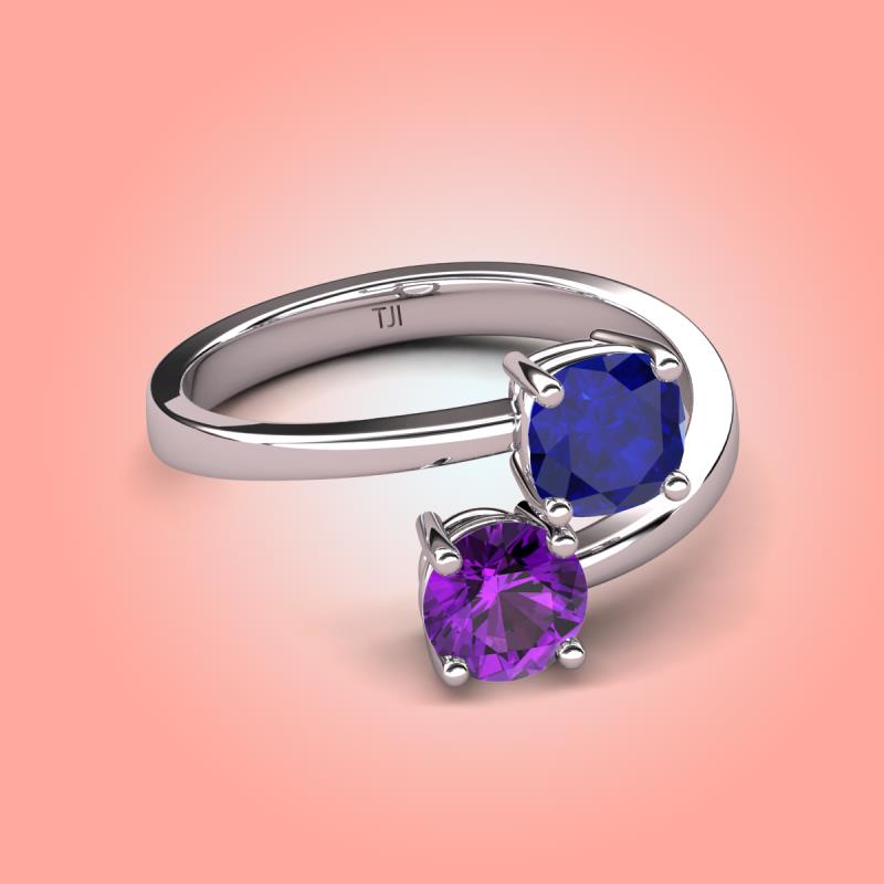 DetailsCharming bypass style 2 stone Promise Ring features Cushion Lab Created Blue Sapphire and Round Amethyst, symbolizes two souls coming together. A two-stone ring will be perfect for adding a dash of elegance to your jewelry box.