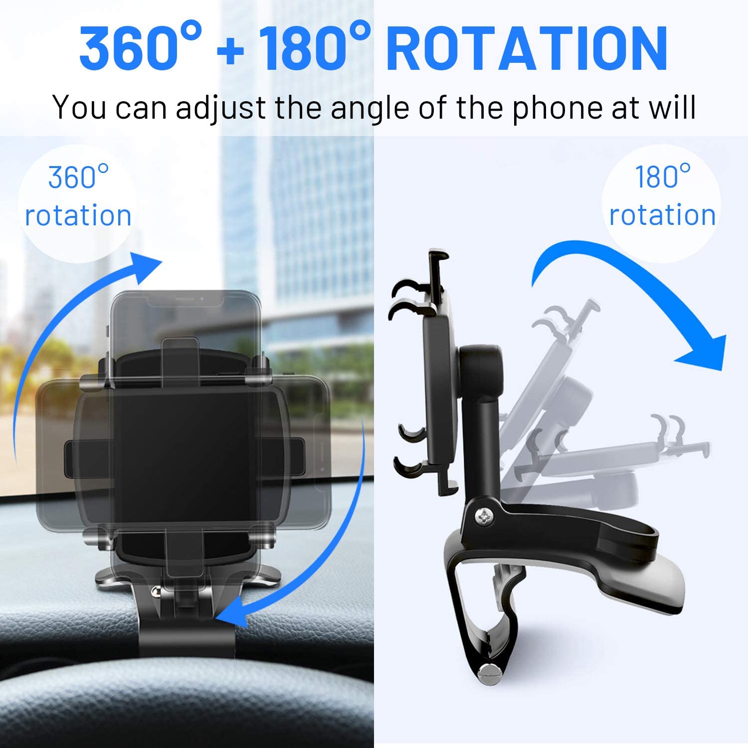 360°Rotation & 180°Tilt: The upgrade car phone mount not only support 360-degree rotatable switch between horizontal and vertical screens at your will, but also can be 180° tilt will provide you with the best viewing angle, , so you could see the phone screen clearly and keep secure driving rather than limited by view angle.