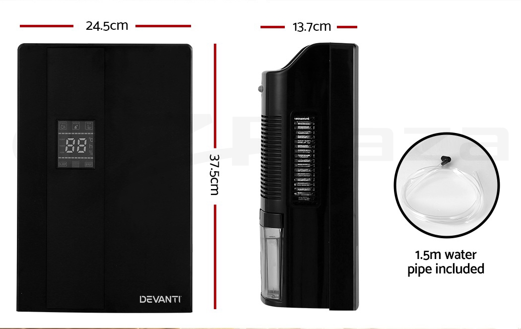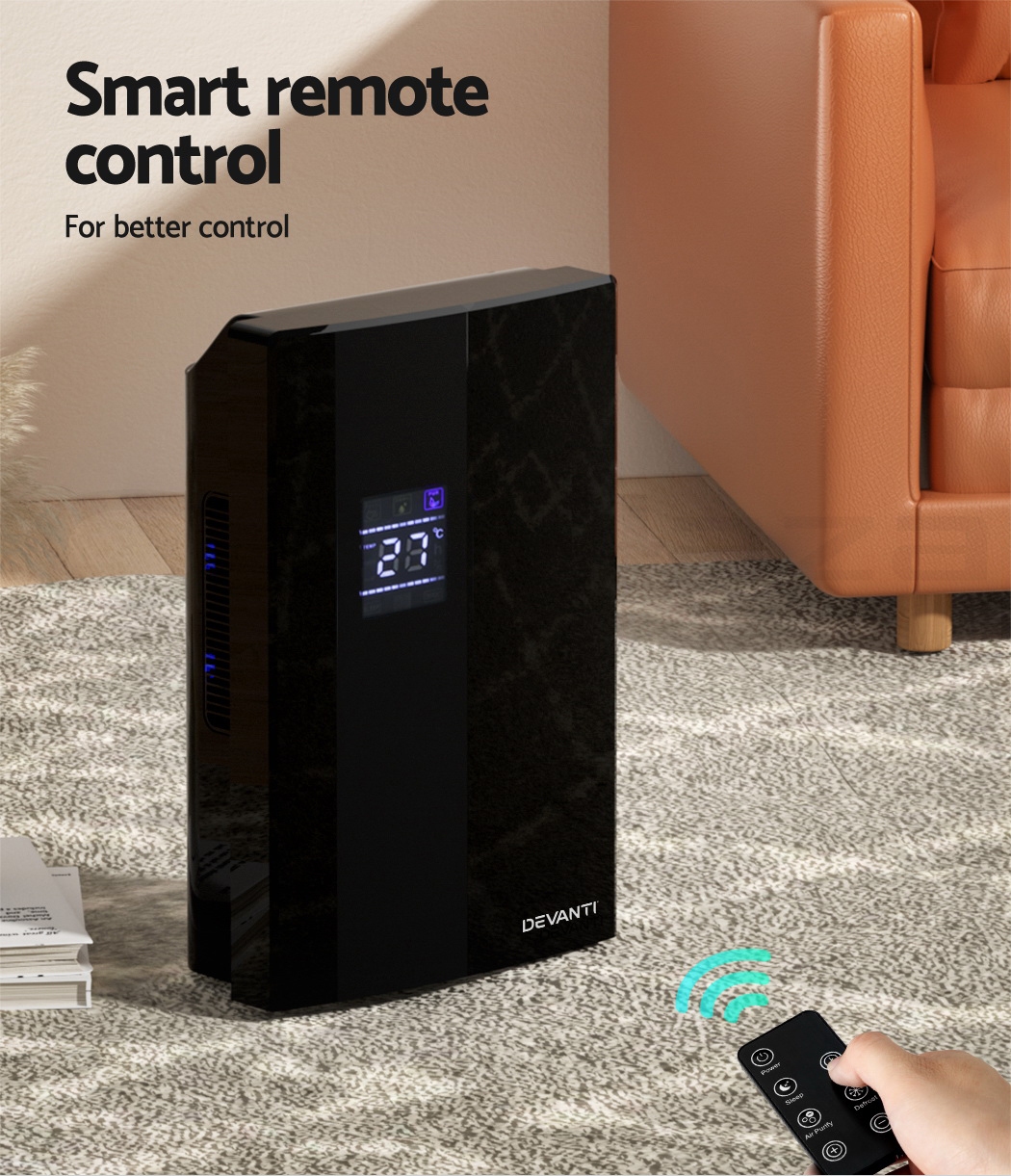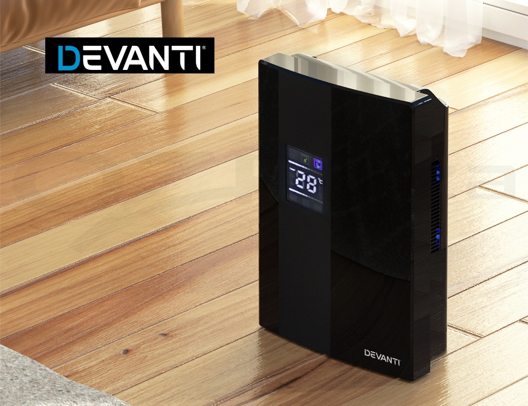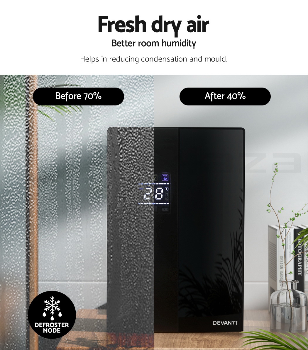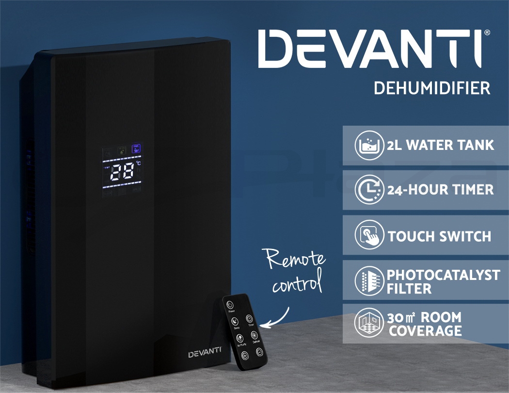 Do you have recurring moisture issues in your home, like mould growth or heavy condensation? Or are you just looking for something to clear the air? Then you need the Devanti Dehumidifier for your home. Many home pests love moist and dark environments, but our dehumidifier will pull water out of the air to reduce damaging moisture in your surroundings, preventing mould, dust mite and mildew growth in your furniture and clothes. Tired of drying clothes indoors? Use the dehumidifier to speed things along – helps to dry clothes faster without using a dryer. The photocatalyst filter removes bacteria and allergens from the air, making the machine a 2-in-1 dehumidifier and air purifier. Control from anywhere inside the home with the included Smart Controller and set timers for up to 24 hours for automatic peace of mind. The dehumidifier operates whisper quiet, so you won’t need to worry about interrupted sleep or household activities. Select from two draining options: The 2L removable water tank with full tank indicator, or continuous drainage with the included 1.5m water pipe. Other great features include an auto-defrost mode for proper machine maintenance, two convenient handles for portability and 30㎡ coverage to suit both small and larger rooms. Turn your home from damp to delightful with a Devanti Dehumidifier.