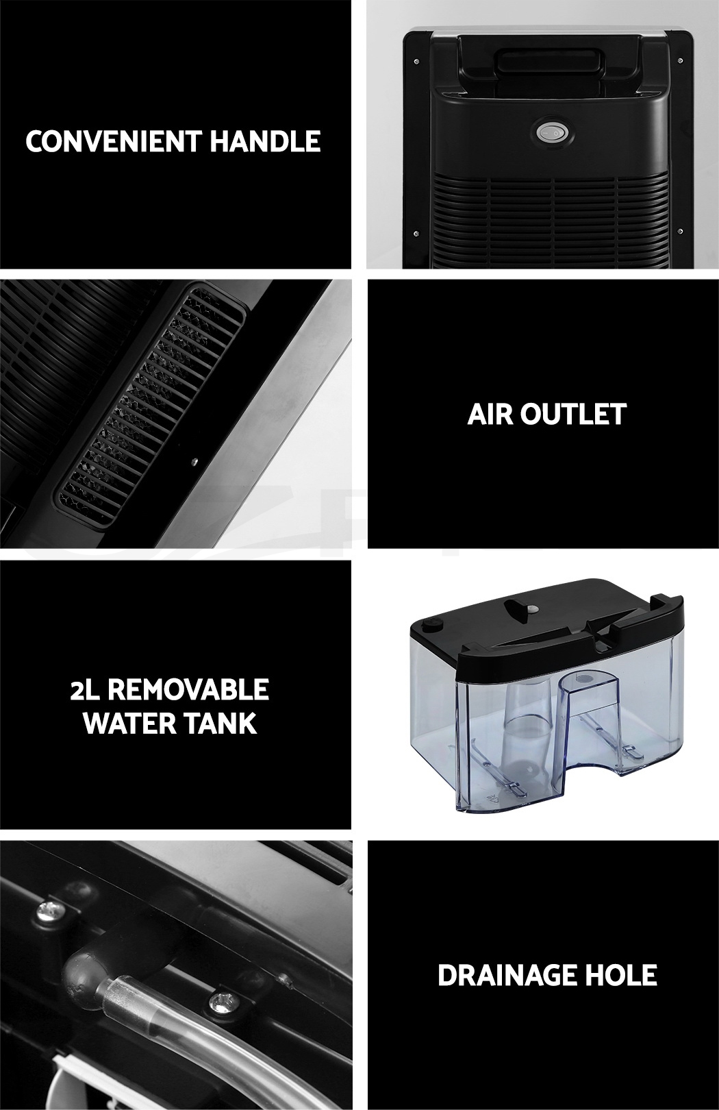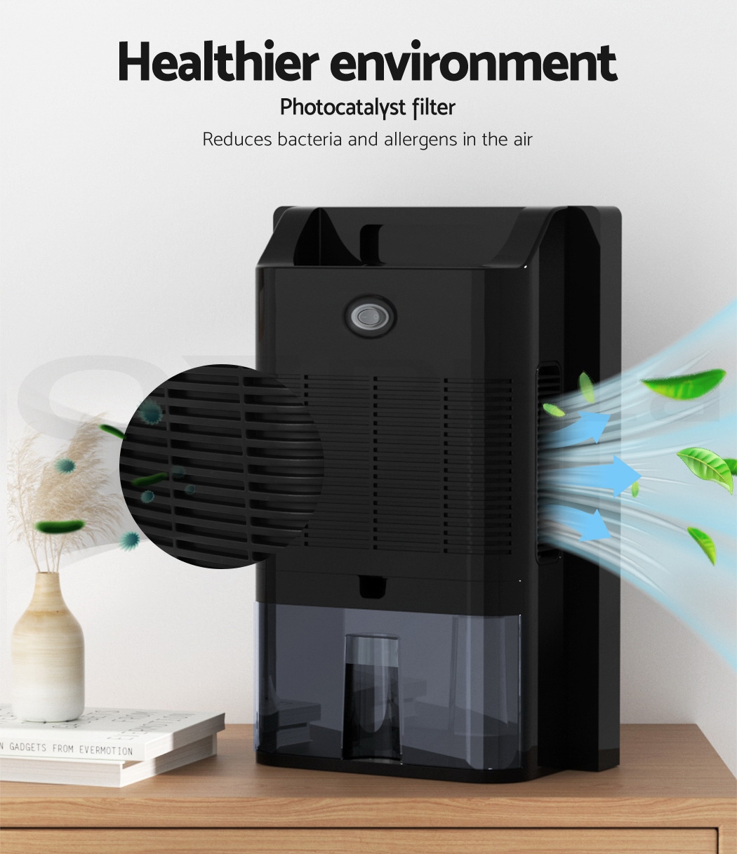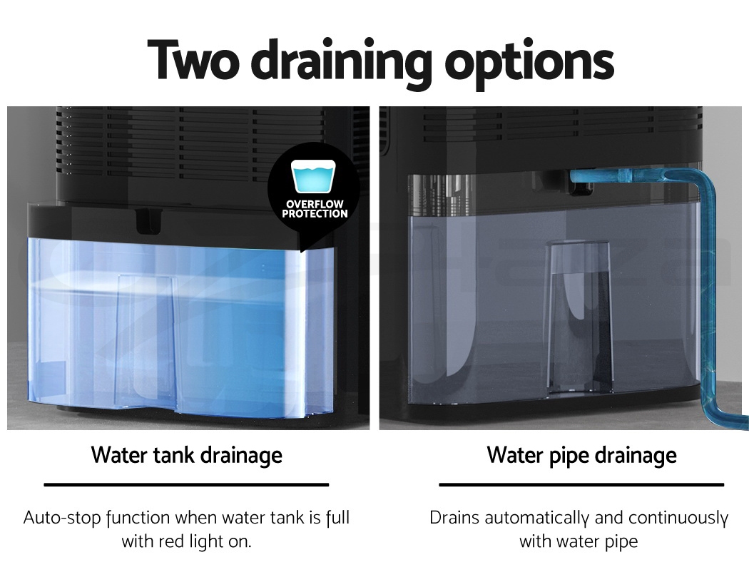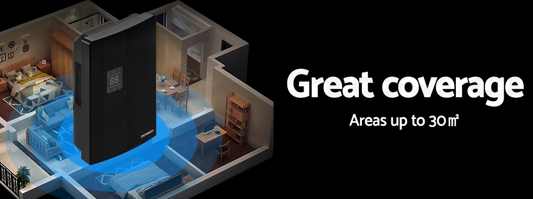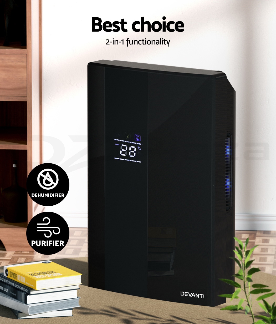 Do you have recurring moisture issues in your home, like mould growth or heavy condensation? Or are you just looking for something to clear the air? Then you need the Devanti Dehumidifier for your home. Many home pests love moist and dark environments, but our dehumidifier will pull water out of the air to reduce damaging moisture in your surroundings, preventing mould, dust mite and mildew growth in your furniture and clothes. Tired of drying clothes indoors? Use the dehumidifier to speed things along – helps to dry clothes faster without using a dryer. The photocatalyst filter removes bacteria and allergens from the air, making the machine a 2-in-1 dehumidifier and air purifier. Control from anywhere inside the home with the included Smart Controller and set timers for up to 24 hours for automatic peace of mind. The dehumidifier operates whisper quiet, so you won’t need to worry about interrupted sleep or household activities. Select from two draining options: The 2L removable water tank with full tank indicator, or continuous drainage with the included 1.5m water pipe. Other great features include an auto-defrost mode for proper machine maintenance, two convenient handles for portability and 30㎡ coverage to suit both small and larger rooms. Turn your home from damp to delightful with a Devanti Dehumidifier.