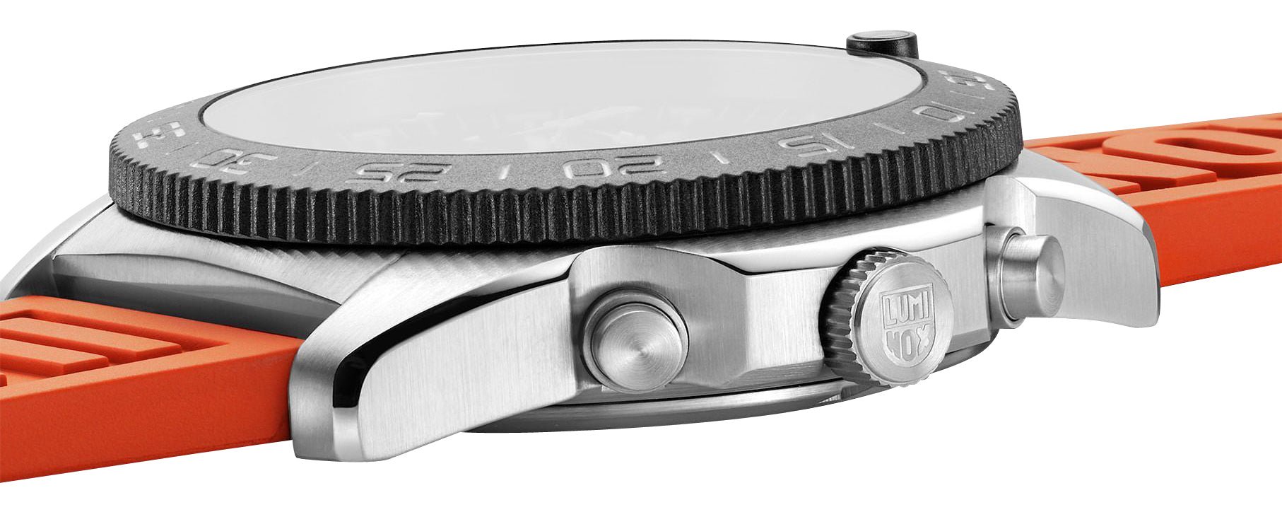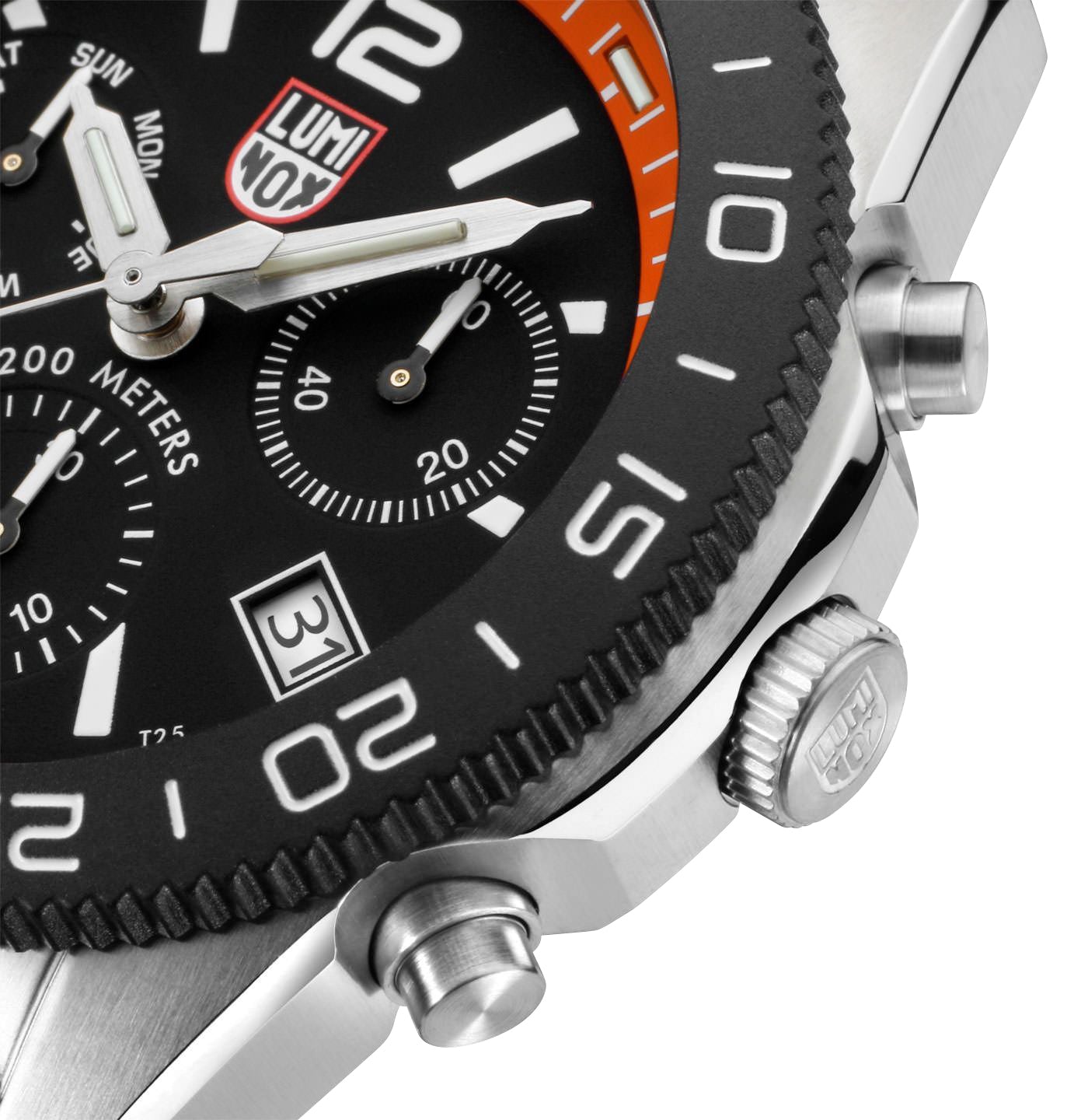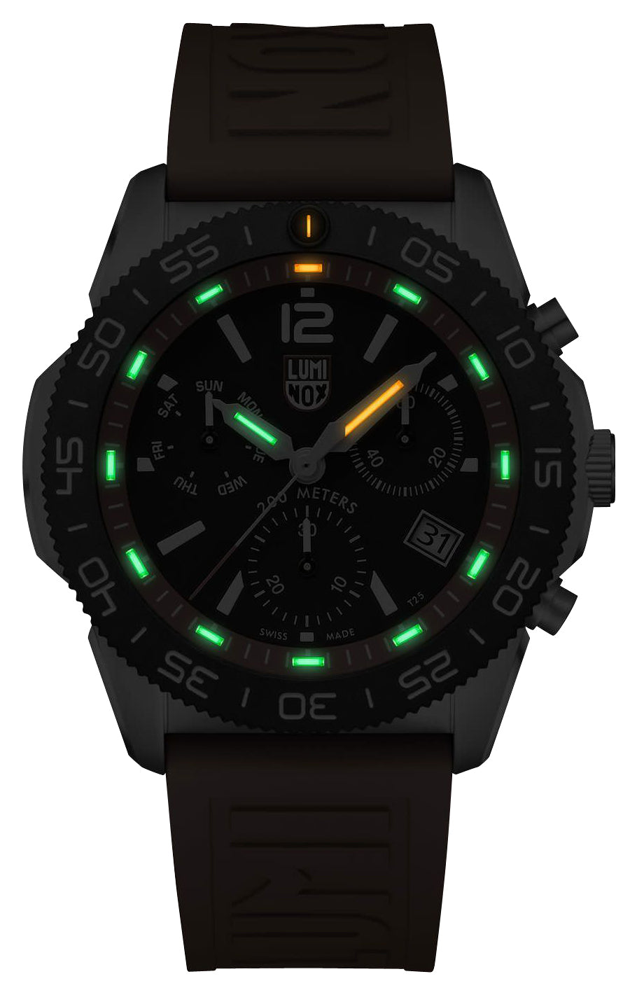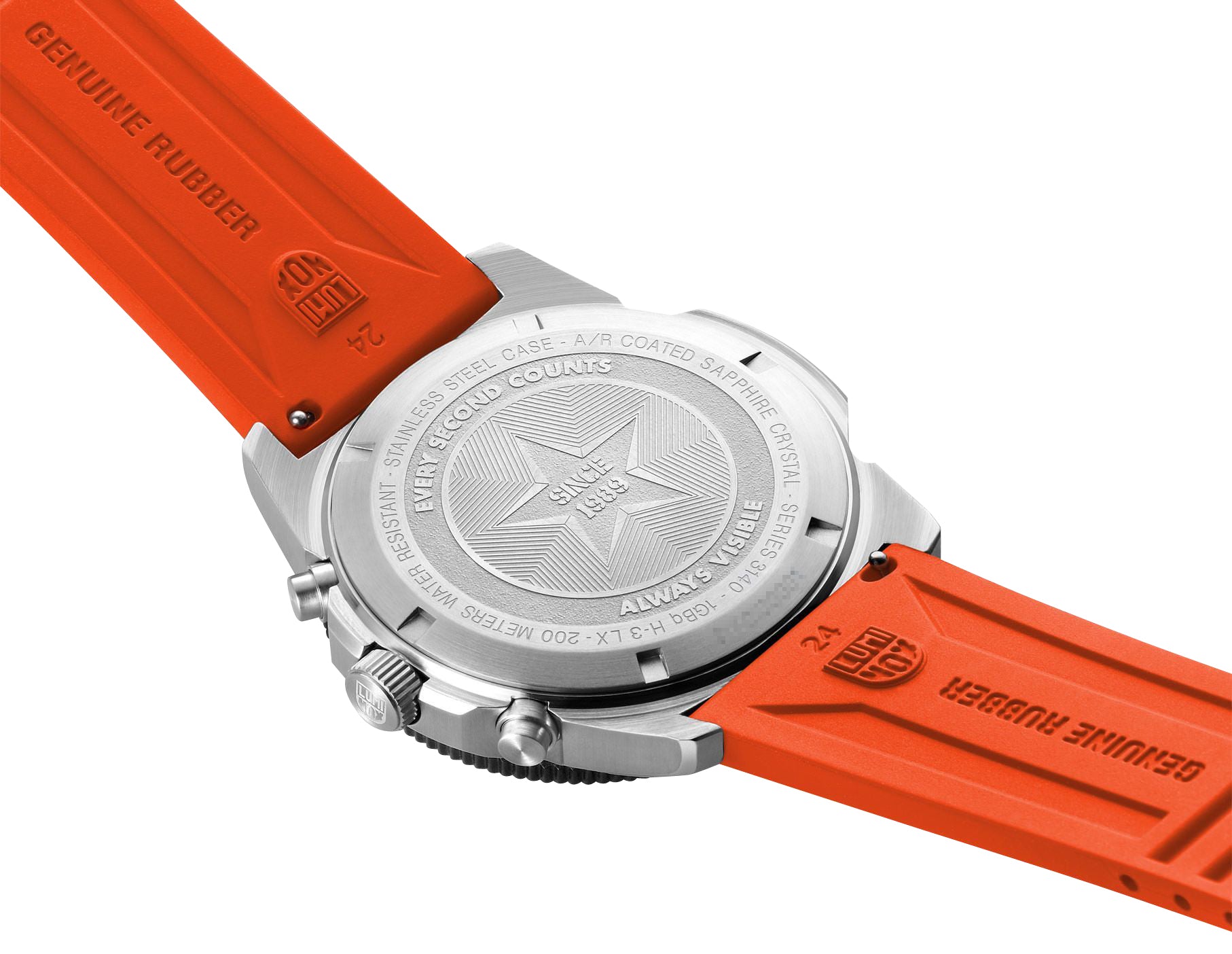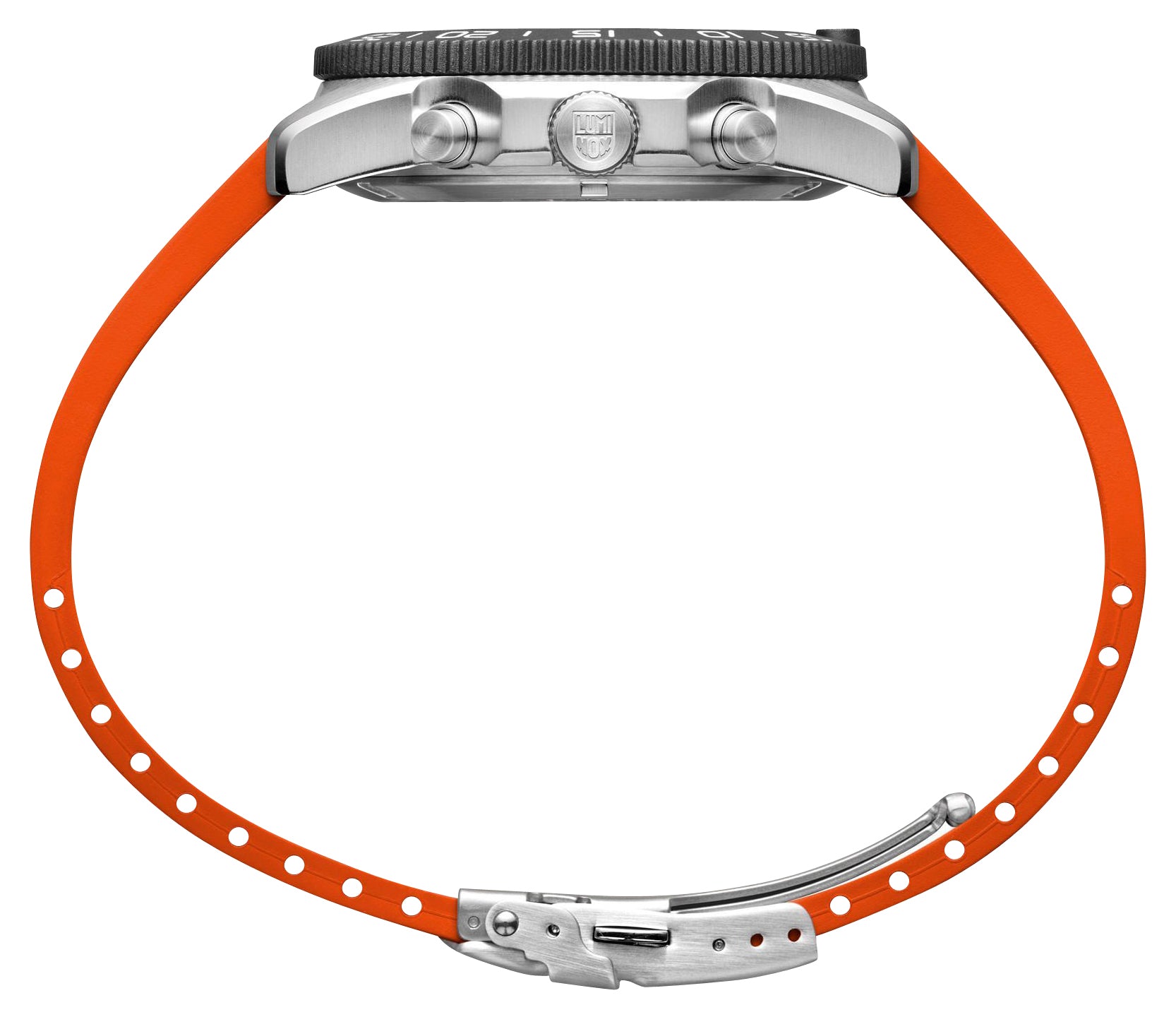 Luminox Pacific Diver Chronograph Stainless Steel Black Dial Orange Rubber Strap Day/Date Divers Quartz Mens Watch Model# XS.3149 / 3149 Luminox and the Pacific are inexorably linked. With its aim to designing, engineering and manufacturing the toughest watches for the toughest people on the planet like the Navy SEALs, whose training base is on the Pacific Coast, in Coronado, across from San Diego. This new Pacific Diver in chronograph form features a 44 mm stainless steel case with a matte black dial contrasted by silver-tone syringe-style hands, white indices, and an Arabic numeral at the 12 o'clock position. Tritium-based luminescent tubes illuminate the watch via the hour, minute, and seconds hands and along the orange chapter ring as well as the bezel tip. This is complemented by a scratch-resistant sapphire crystal with an anti-reflective coating, a uni-directional rotating CARBONOX bezel with a 60-minute scale, and a date window at the 4 o'clock position. The three subdials feature 60-second and 30-minute counters and a day indicator. An orange cut-to-fit rubber strap secured by a folding clasp with safety and double push-button release completes the tough and sporty look. This watch has a solid caseback inscribed with the marking "Every Second Counts" wherein underneath lies the Ronda caliber Z60, a Swiss quartz chronograph movement and is water-resistant up to 200 meters/660 feet.