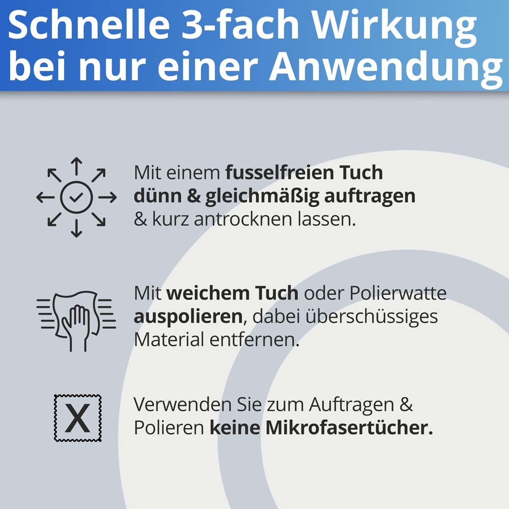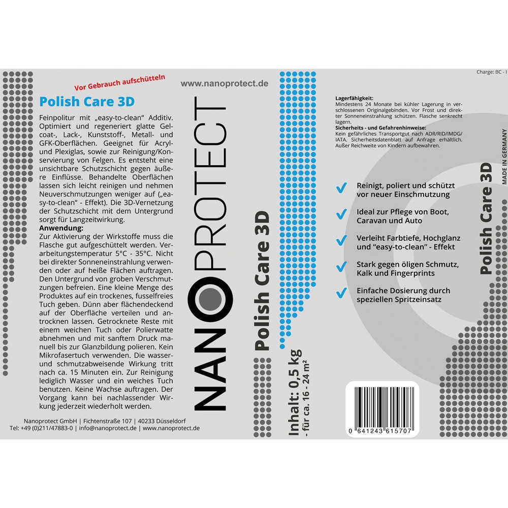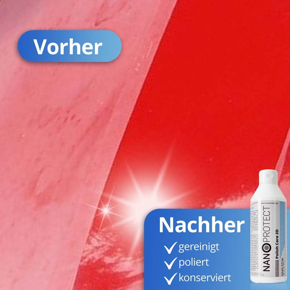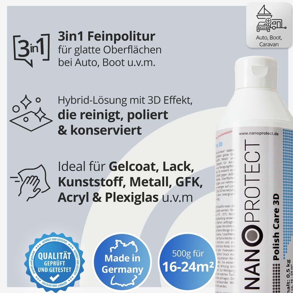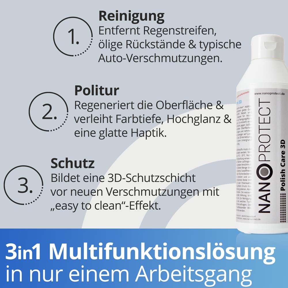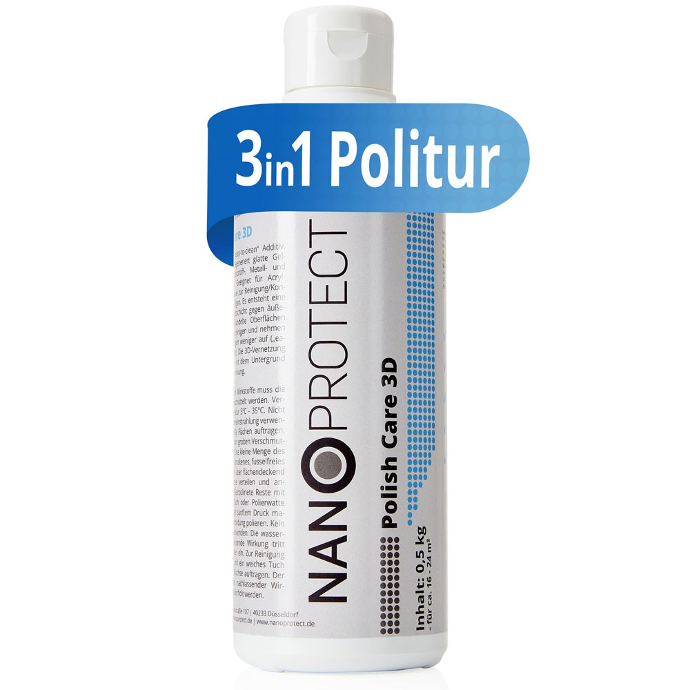 Nanoprotect-Polish Care 3D ist eine Hochglanz Feinpolitur mit Nano Additiv für einen langanhaltenden Lotus Effekt. Mit diesem "all-in-one" Produkt lassen sich Oberflächen kinderleicht und in einem Arbeitsgang reinigen, farblich auffrischen und gleichzeitig Beschichten.