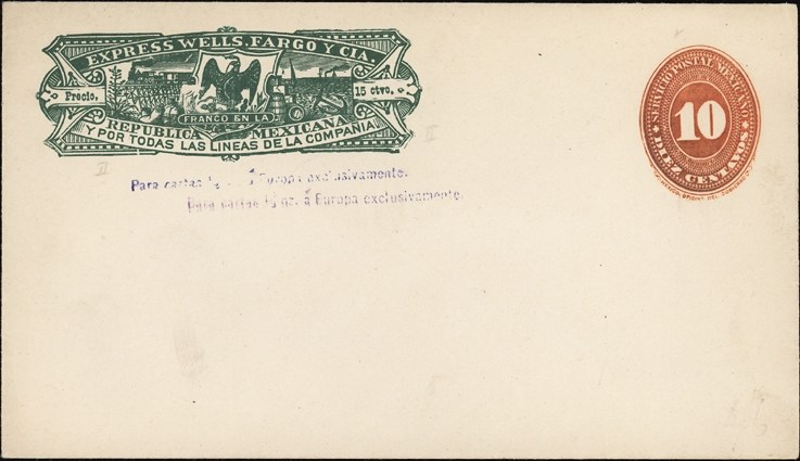 Mexico, 1891. Wells Fargo Envelope, 1/2 oz, Size a, 10c red numeral, 15 ctvo. Frank, Double Strike of Europe line 3. UPSS WF 76, H&G 56. Flap not adhered. Mint, F-VF.
