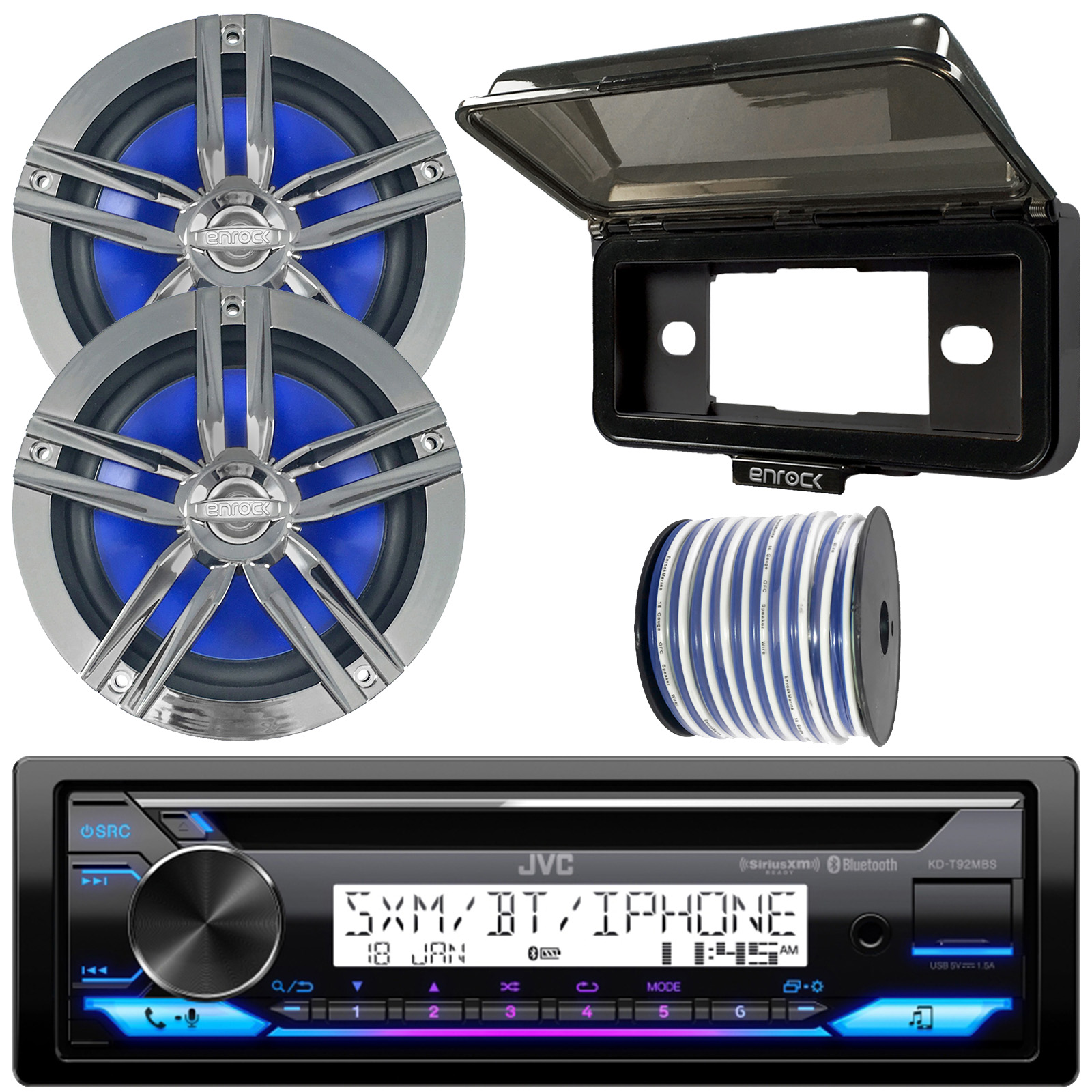 PACKAGE BUNDLE INCLUDES: JVC KD-T92MBS Single DIN Marine MotorSports Bluetooth USB/AUX CD Player AM/FM Radio Stereo Receiver, Black Receiver Dash Kit Cover Protector, 2x Enrock EM265C 6.5" 180 Watts Max Power 2-Way High-Performance Boat Audio Charcoal Speakers, 50 Feet 18 Gauge Speaker Wire