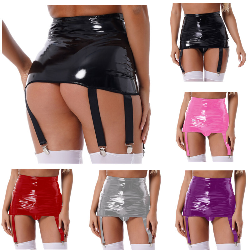 Damen Wetlook Strapshalter mit 6 halter Lack Leder Strumpfgürtel Hosenträgern