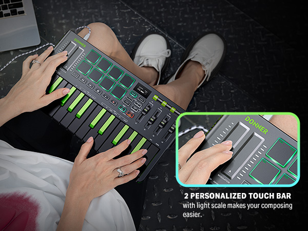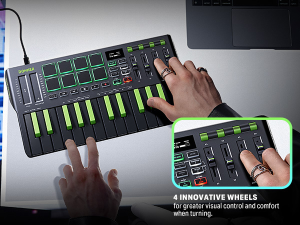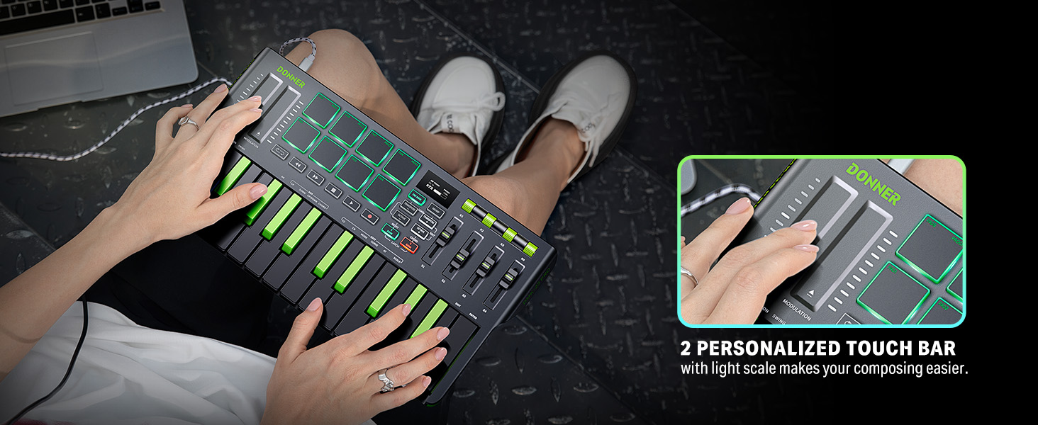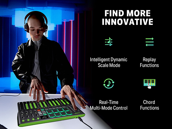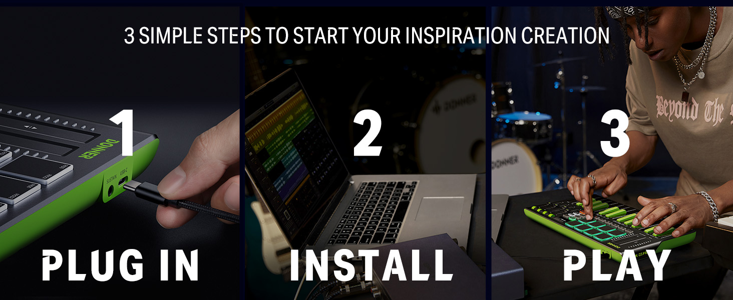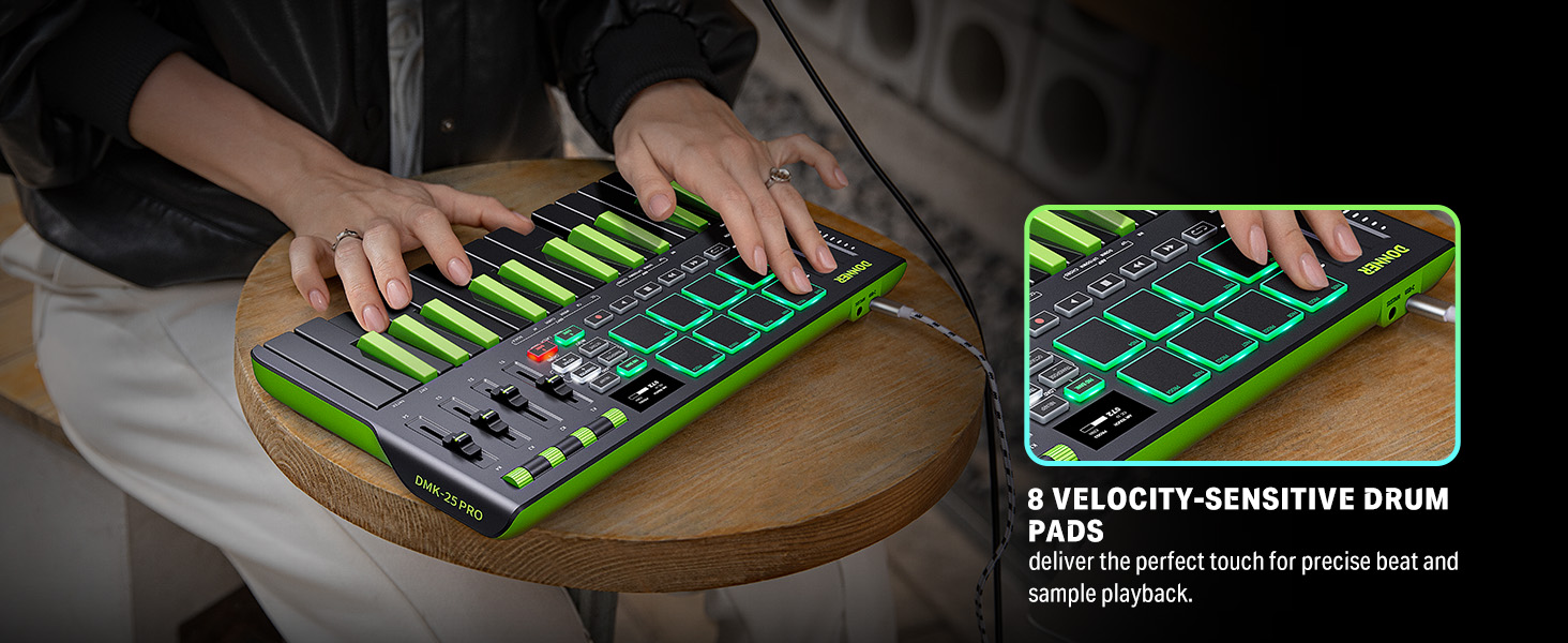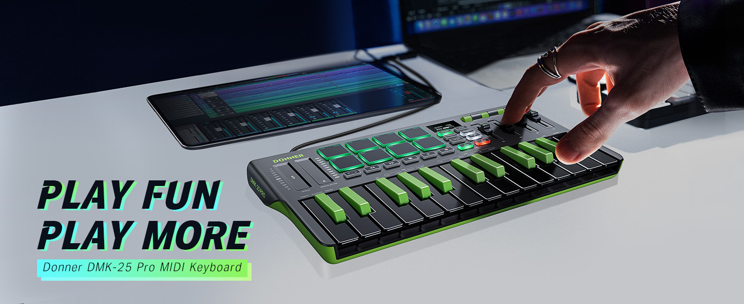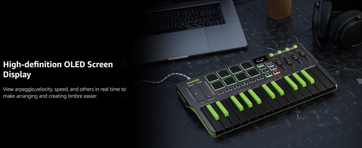【 Real-time Multi-Mode Control】The MIDI controller's powerful arpeggio, note repeat, and chord functions allow you to create the music clips you need whenever and wherever you need them, fully open up the world of your expression and creativity, make music performance more enjoyable, and follow the pace of Donner DMK-25 Pro to explore more playability!