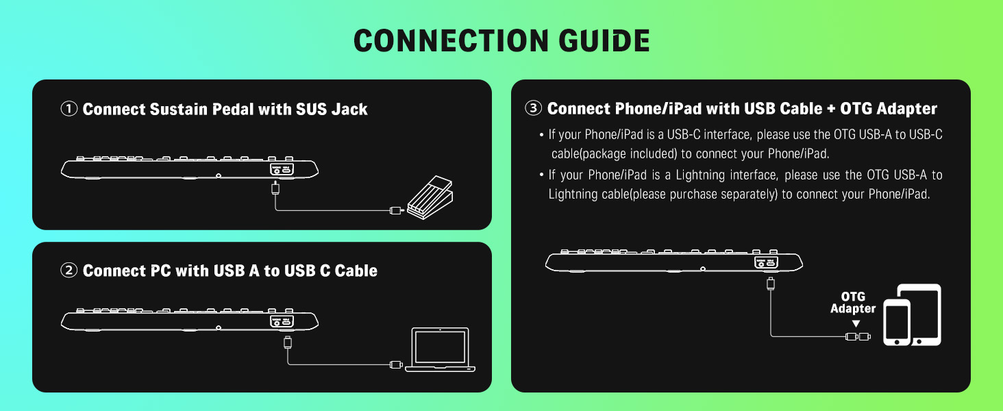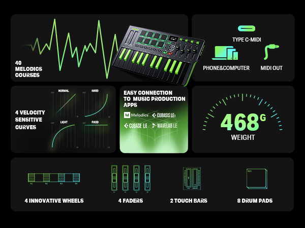【 Intelligent Dynamic Scale Mode】The MIDI keyboard introduces new performance features. You can play essential bass lines, melodies, and leads with ease thanks to intelligent dynamic scale mode. Furthermore, the 16-scale tones enable you to switch between many musical genres. If you enable intelligent dynamic scale mode, you won't have to be concerned about tuning issues when arranging.