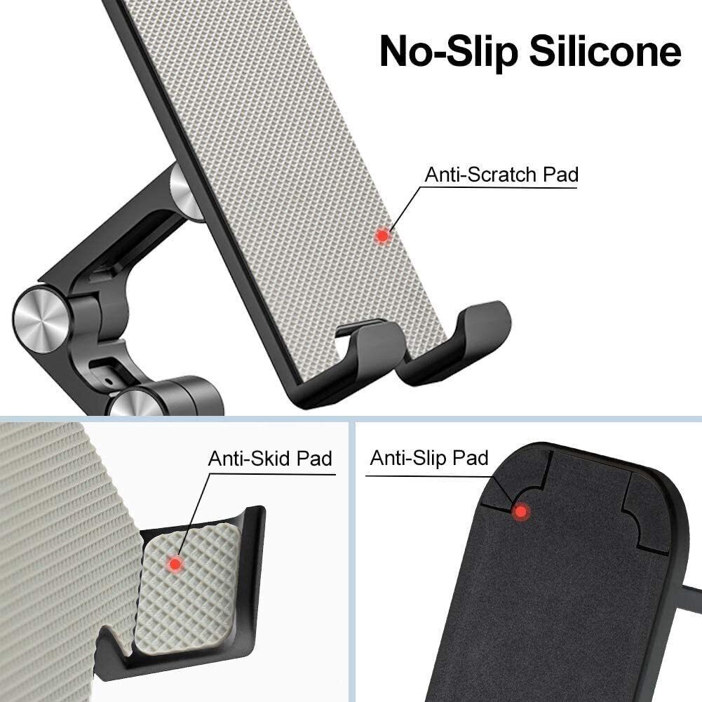 1. STURDY & PROTECTIVE: The cell phone stand is made of high quality plastic, it stays firmly in place, hold your phone steadily, no worry any wobble at all. The anti-slip pads can protect your phone from any scratching and sliding.