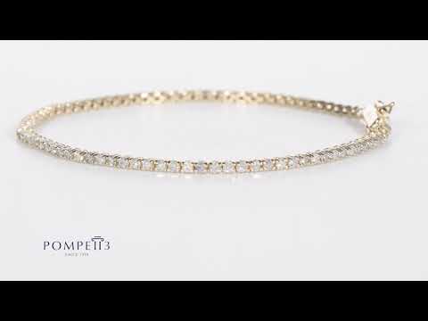 This classic style tennis bracelet features round brilliant cut natural diamonds. All diamonds are prong set in 14k yellow gold. The bracelet is secured by a double locking clasp. Measure a standard 7 inch length.