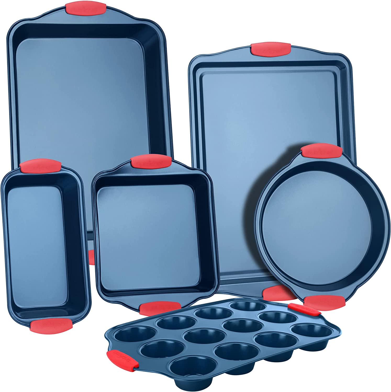 6-Piece Nonstick Bakeware Set - PFOA, PFOS, PTFE-Free Carbon Steel Baking Trays w/ Heat safe Silicone Handles, Oven Safe Up to 450°F, Loaf Muffin Roaster/Round/Square Pans, Cookie Sheet