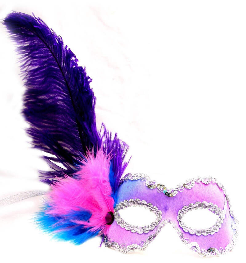 Get into a Carribbean vibe with the Calypso mask! Purple/pink tye dye fashion mask with silver sequin trim, long purple plume, short blue and pink feathers accepted with a glittering rhinestone. Secures with two ribbon ties.